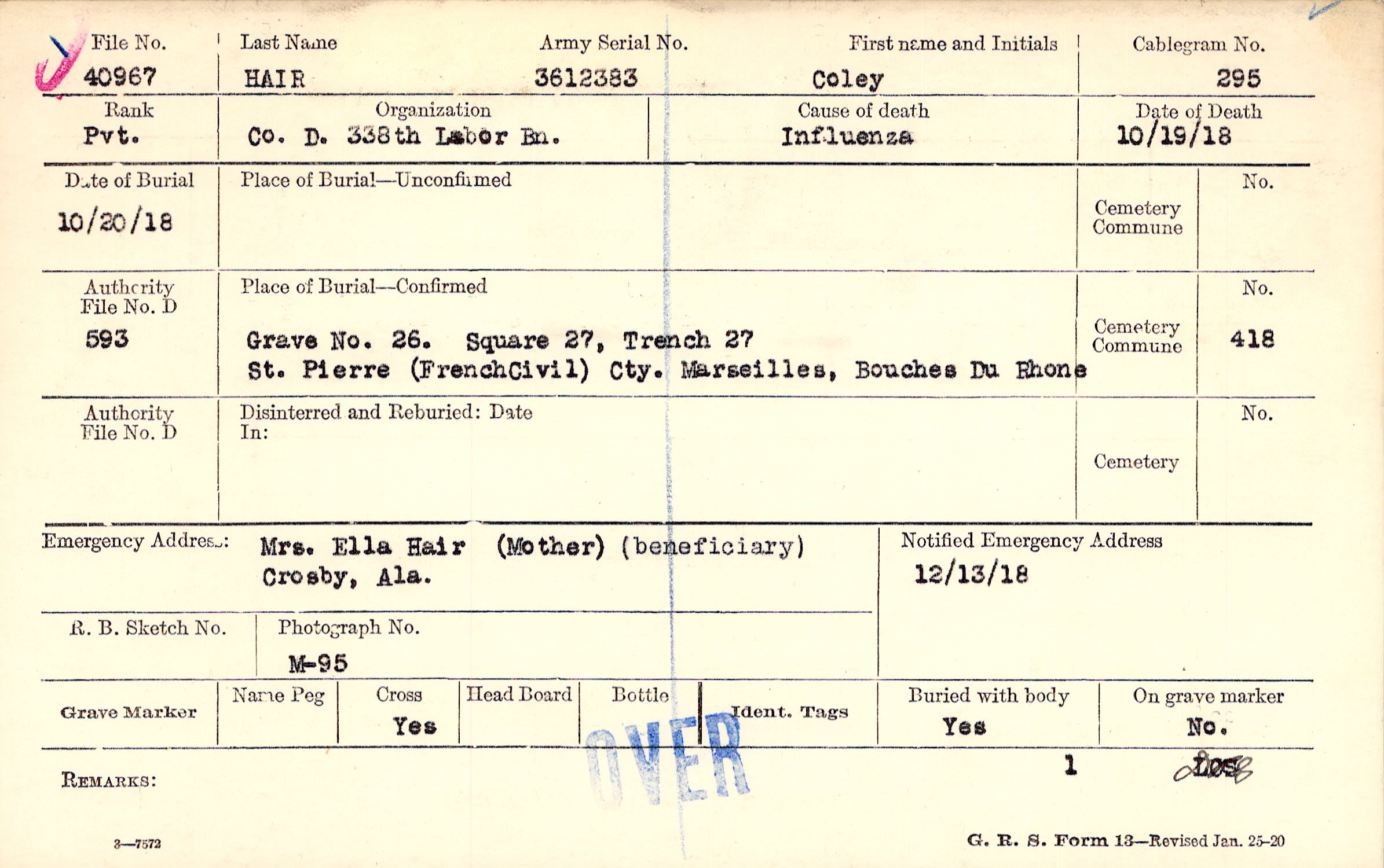 Grave 26, Square 27. Trench 27, St. Pierre, French Civil Cty., Marseilles, Bouches Du Rhone