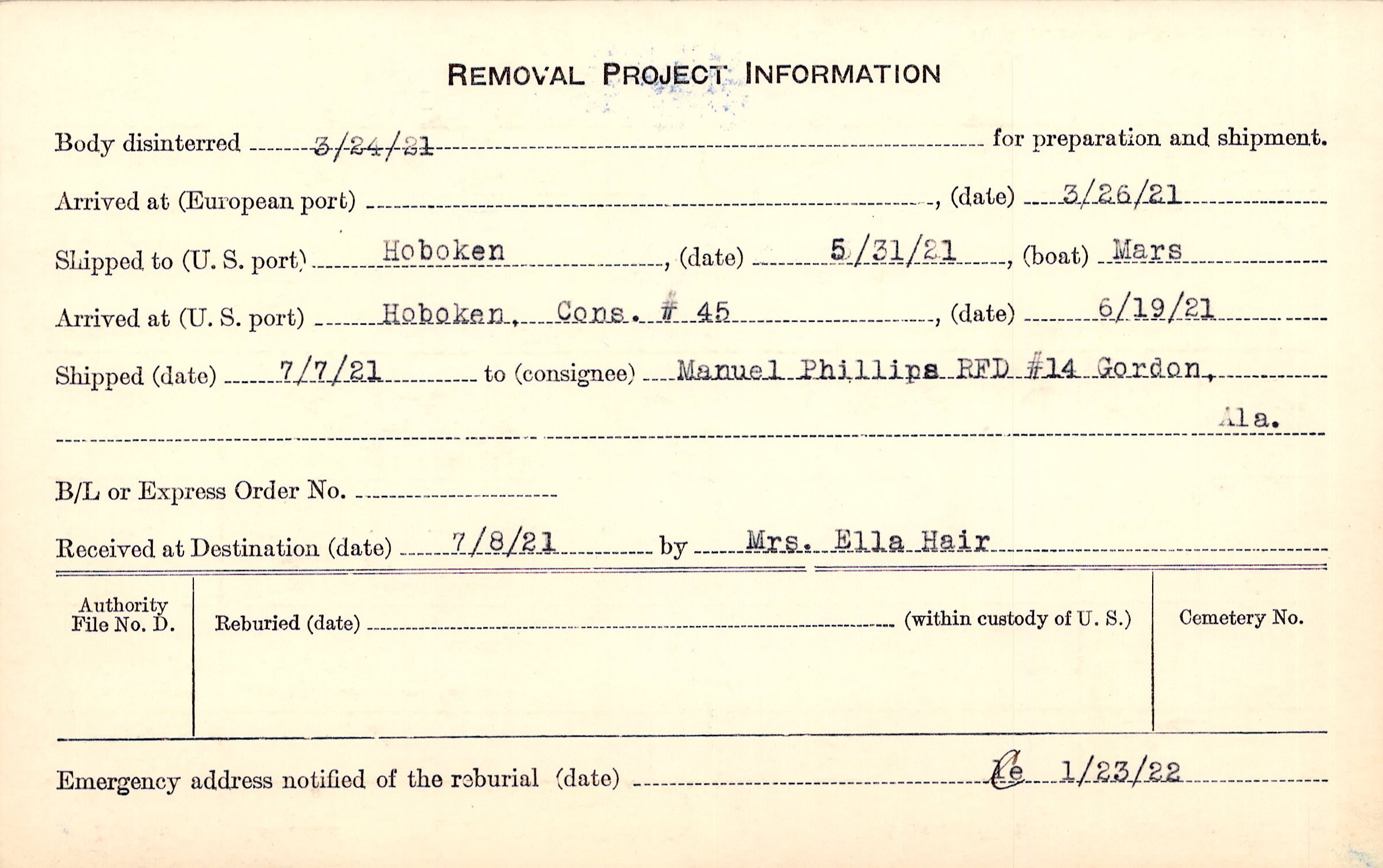 Body disinterred 3/24/1921 for preparation and shipment.