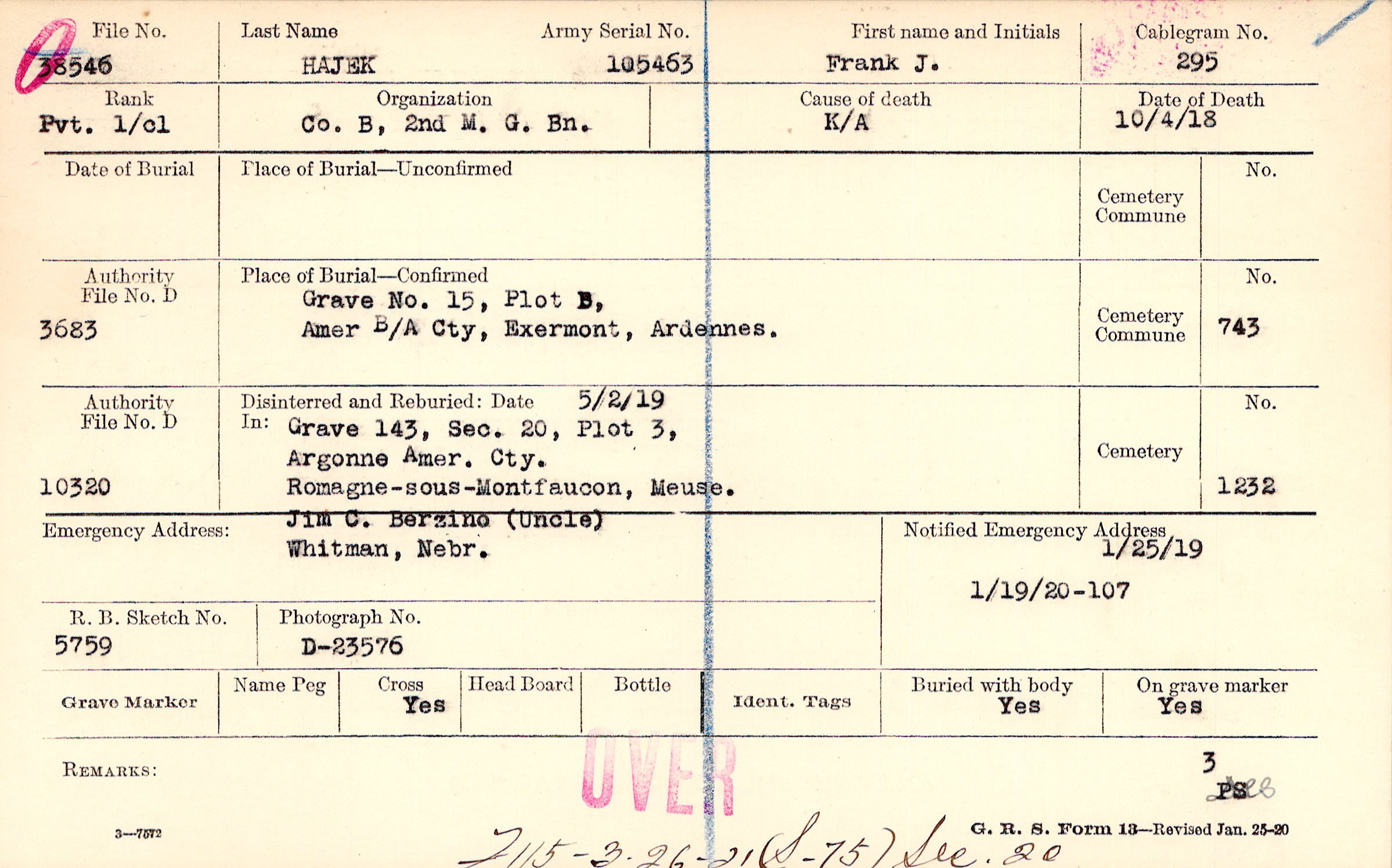 Grave 15, Plot B, Amer B/A Cty, Exermont, Ardennes.