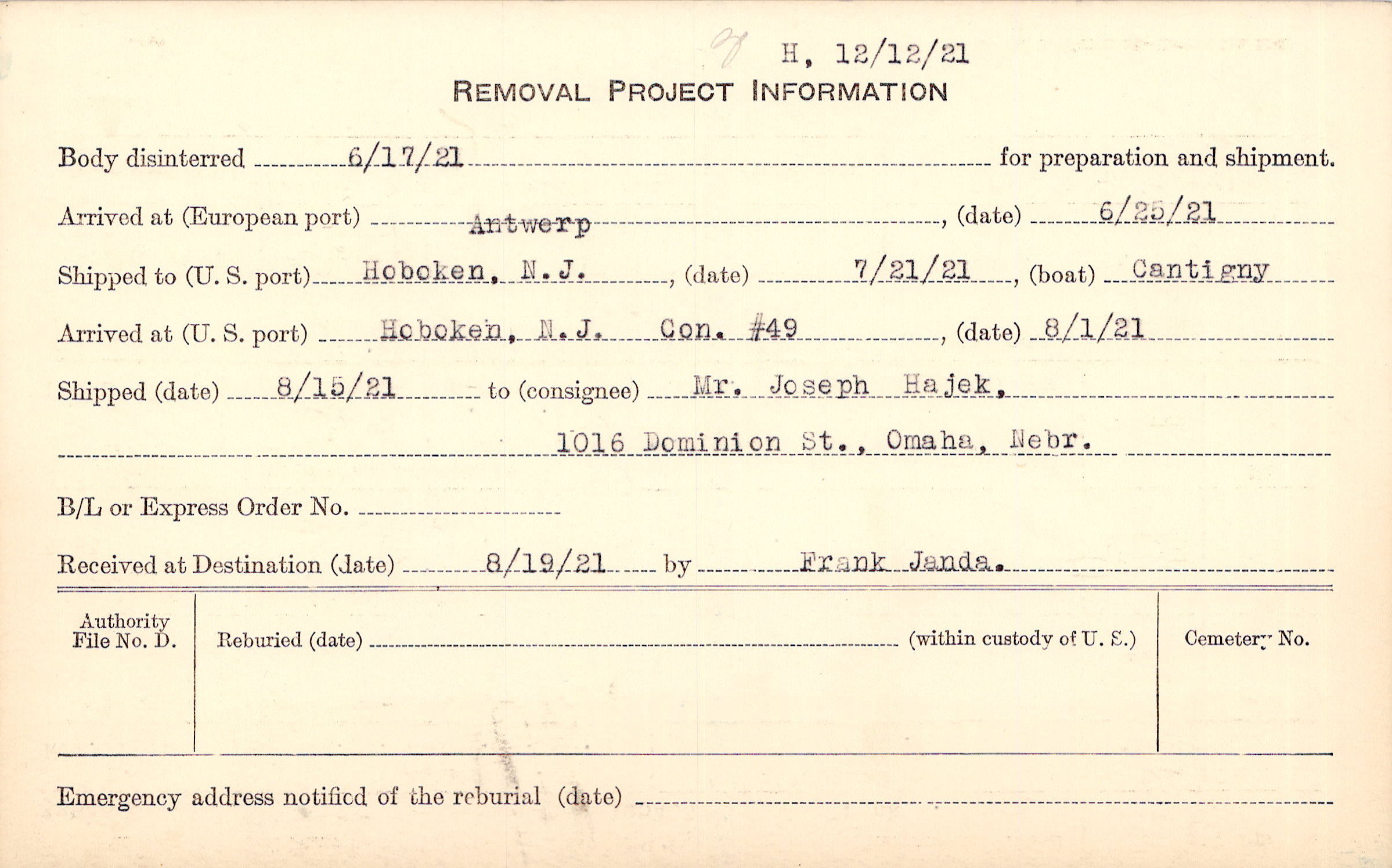 to Mr. Joseph Hajek, 1016 Dominion St., Omaha, Nebr.