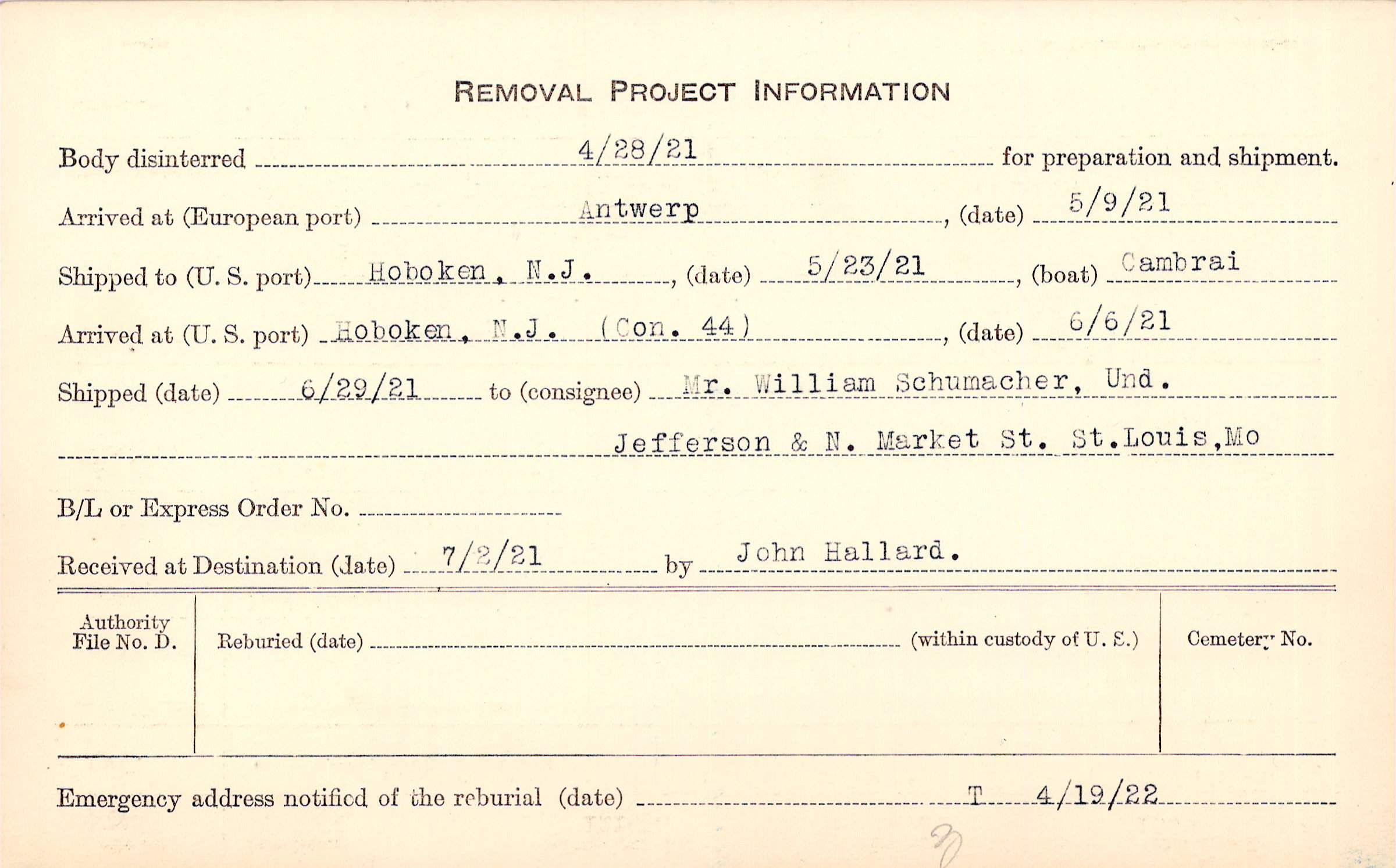 Body disinterred 4/28/1921 for preparation and shipment.