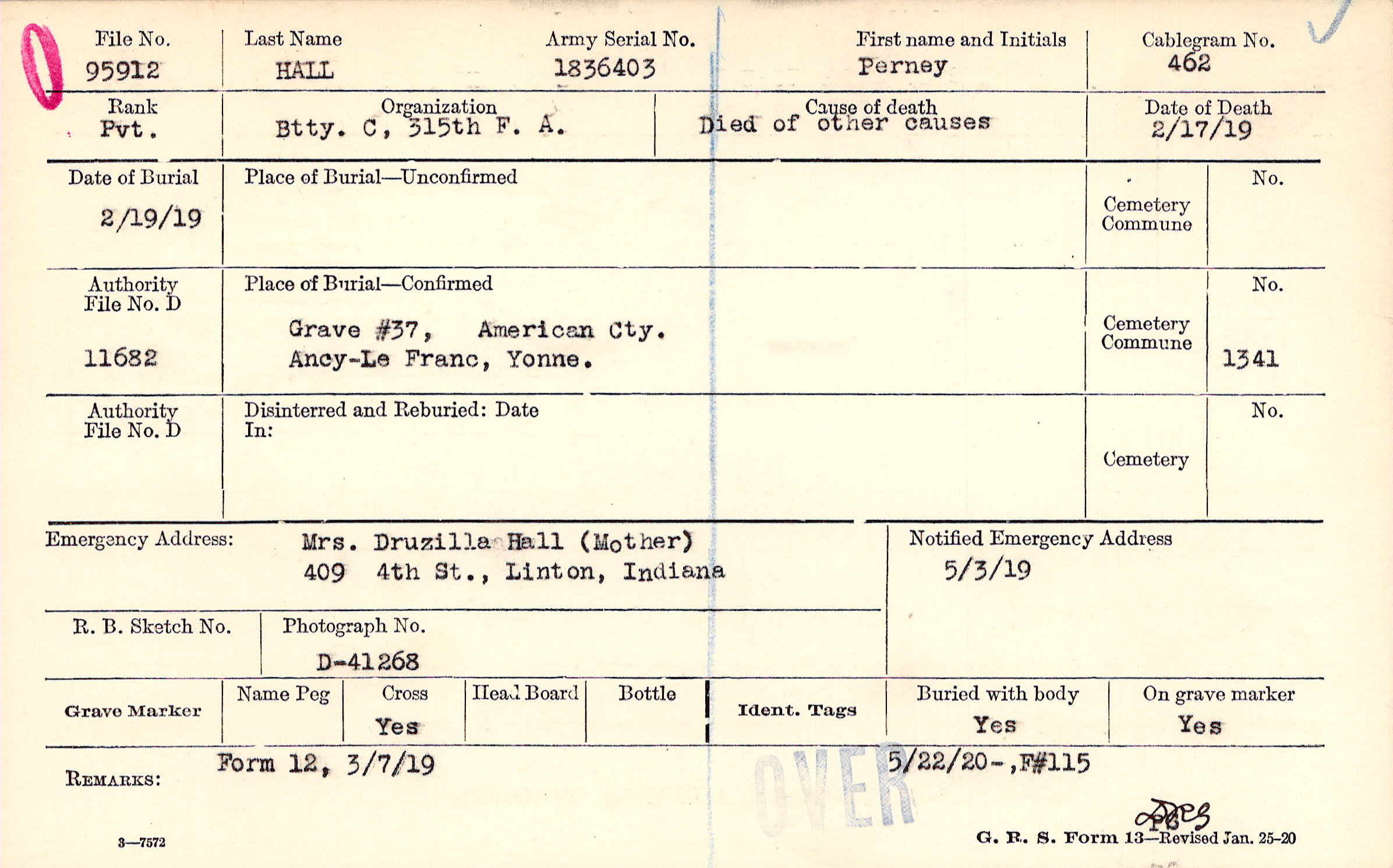 Mrs. Druzilla Hall (Mother), 409 4th St., Linton, Indiana