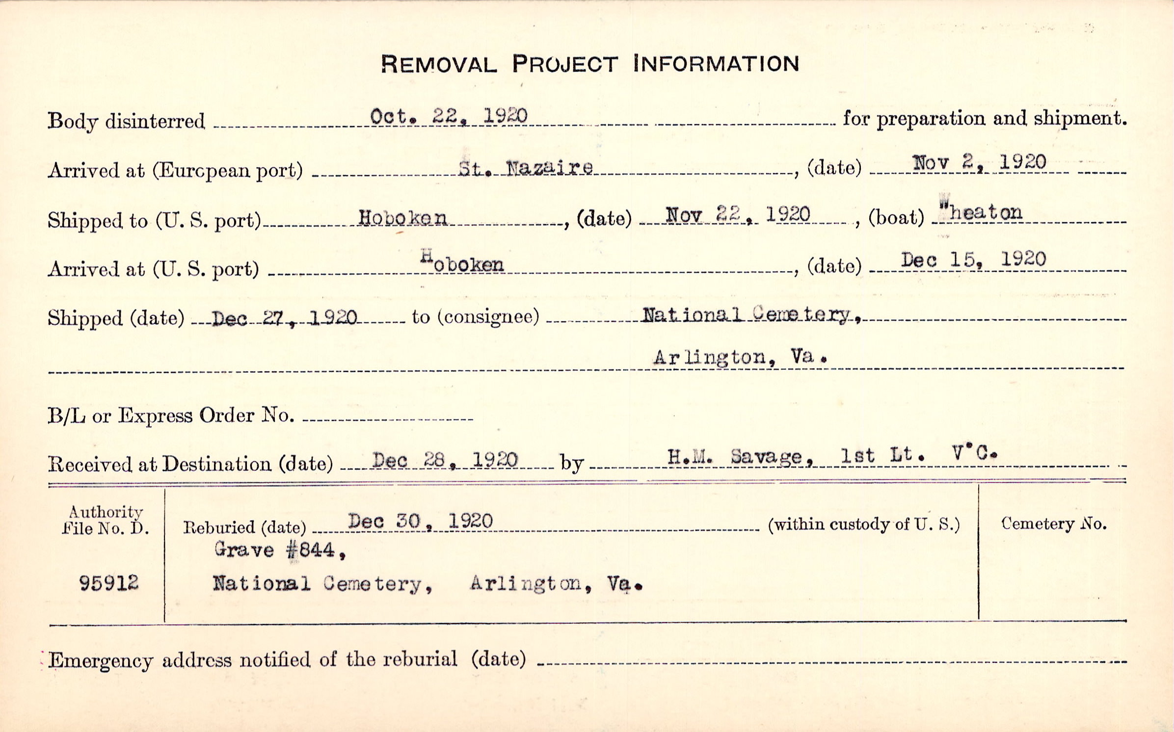 Body disinterred 10/22/1920 for preparation and shipment.