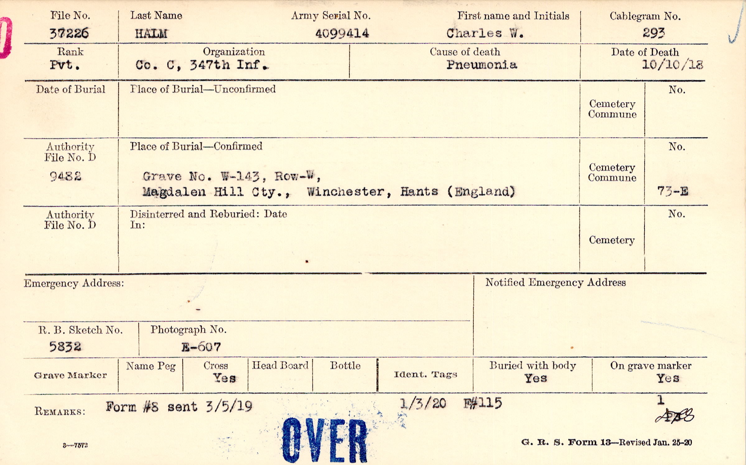Grave W-143, Row-W, Magdalen Hill Cty., Winchester, Hants, (England)