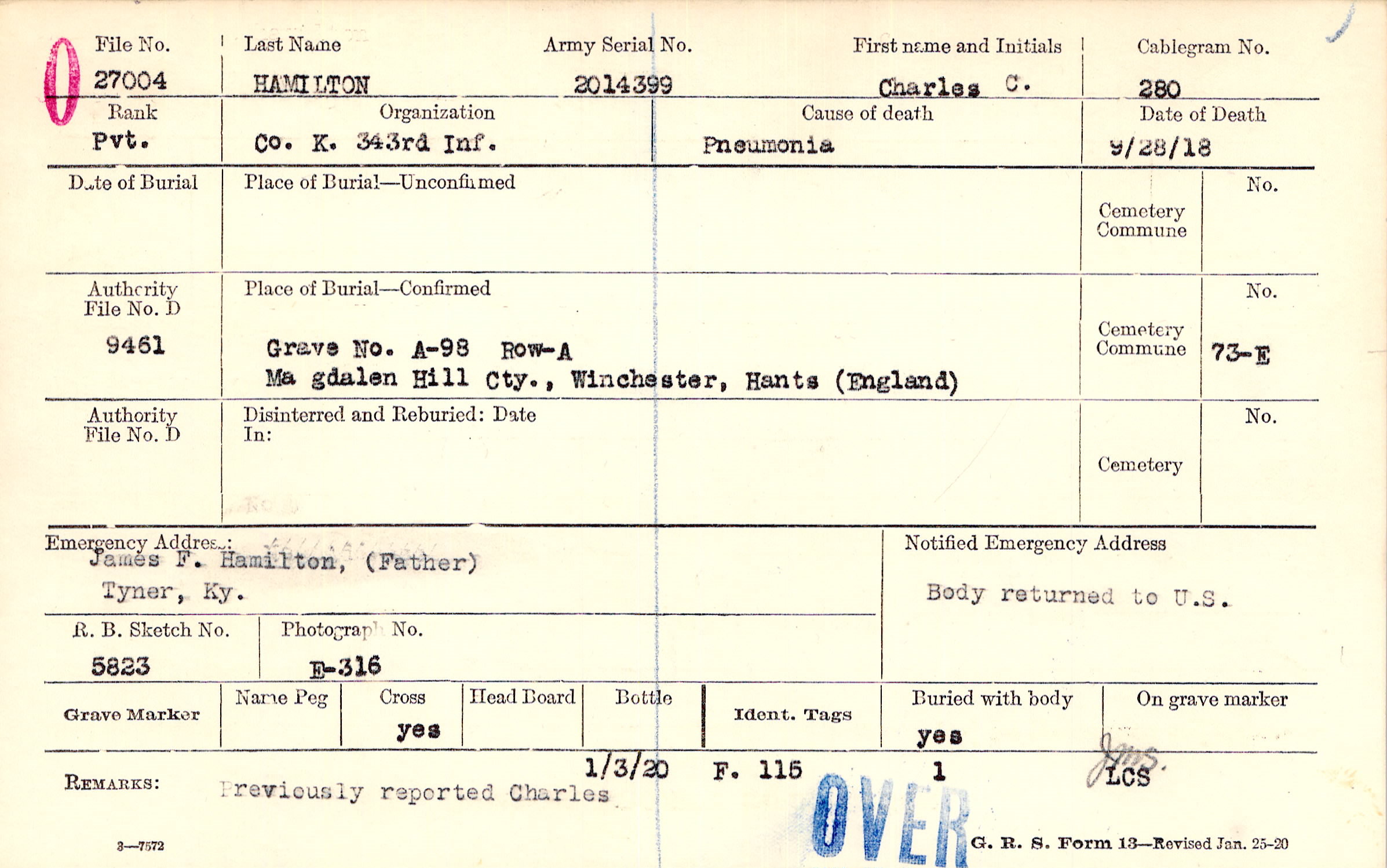 Grave A-98, Row-A, Magdalen Hill Cty., Winchester, Hants, England