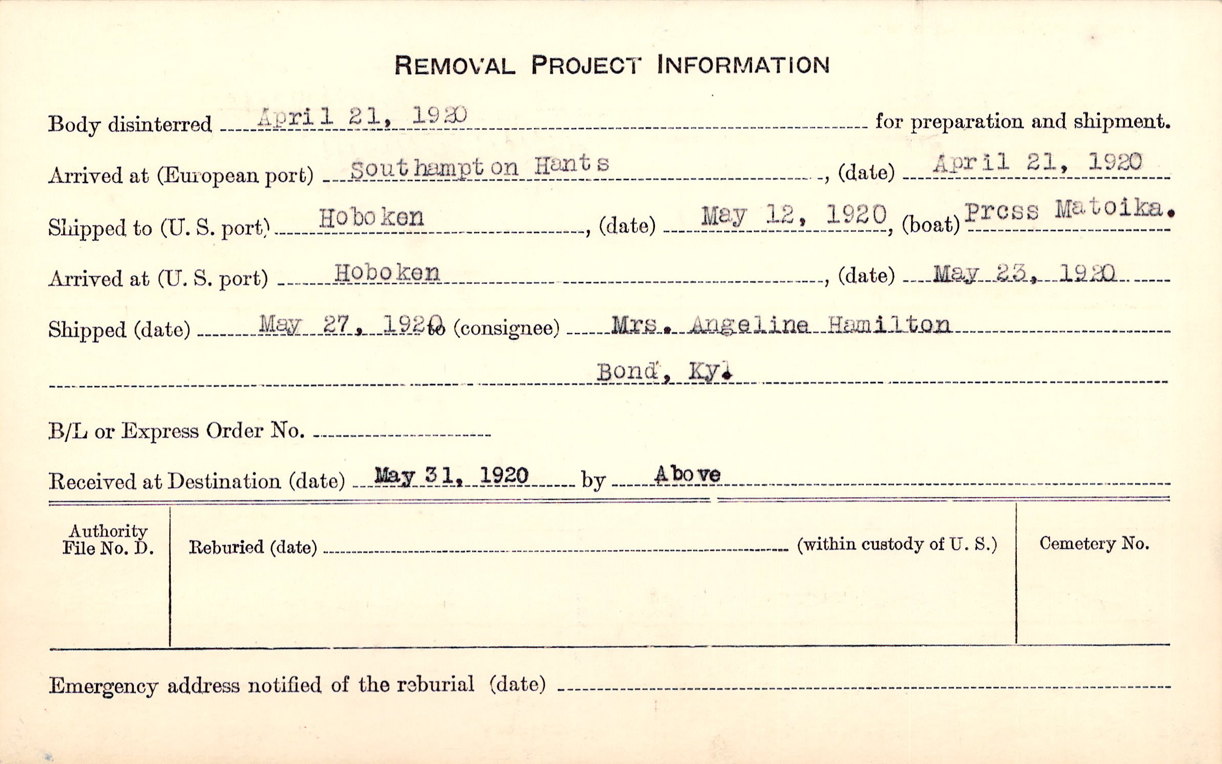 Body disinterred 4/21/1920 for preparation and shipment.