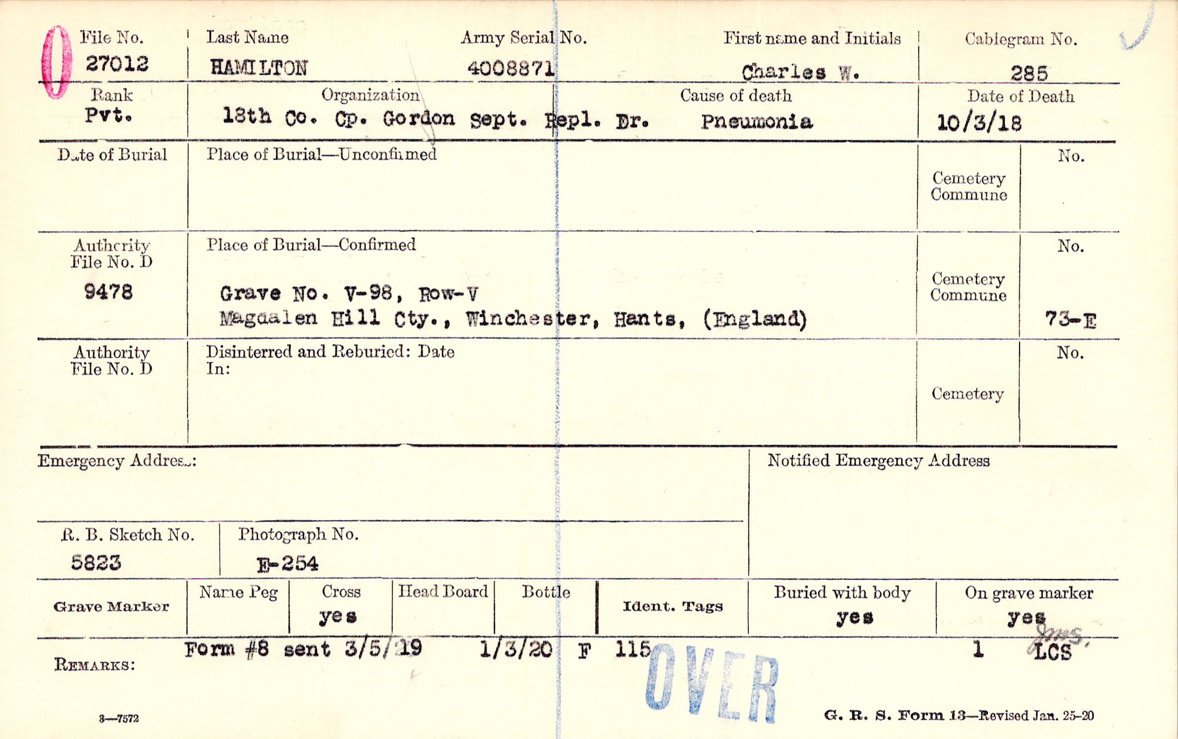 Grave V-98, Row-V, Magdalen Hill Cty., Winchester, Hants., England