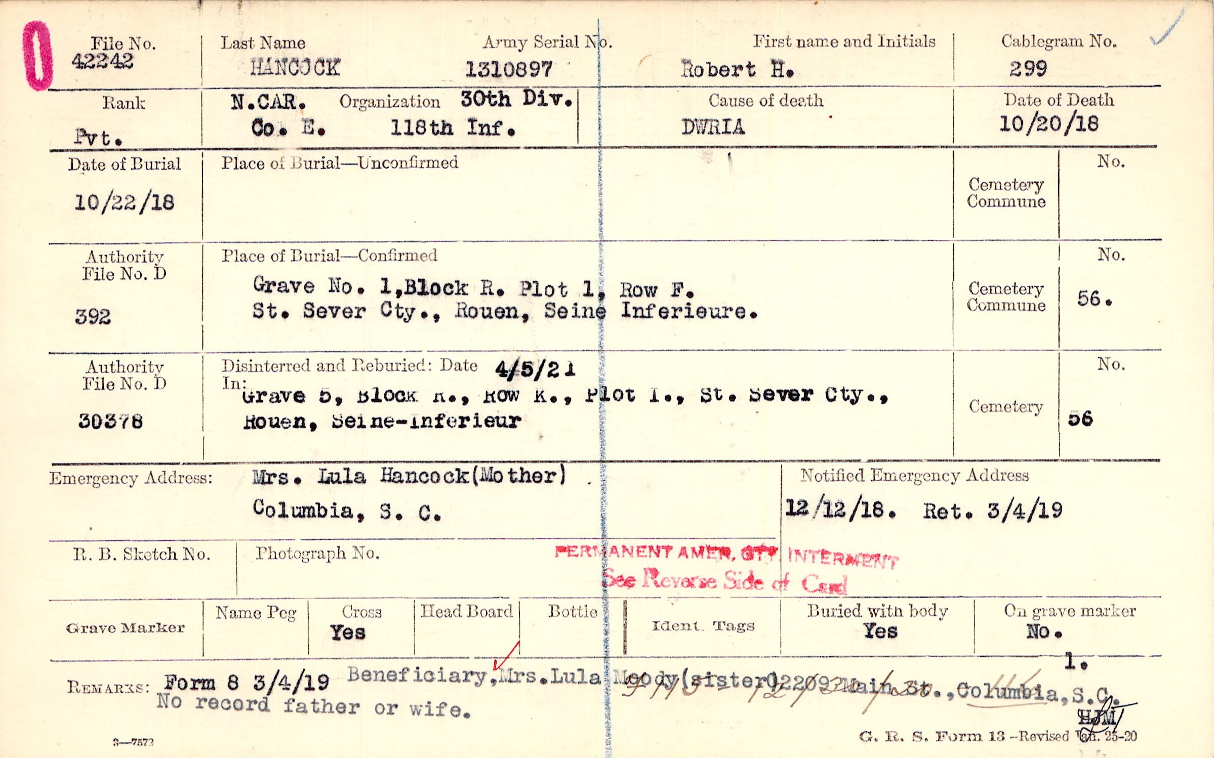 Beneficiary, Mrs. Lula Moody (sister) 2209 Main St., Columbia, S. C. No record father or wife., Form 8 3/4/19, F115 - 12/30/20 - 116