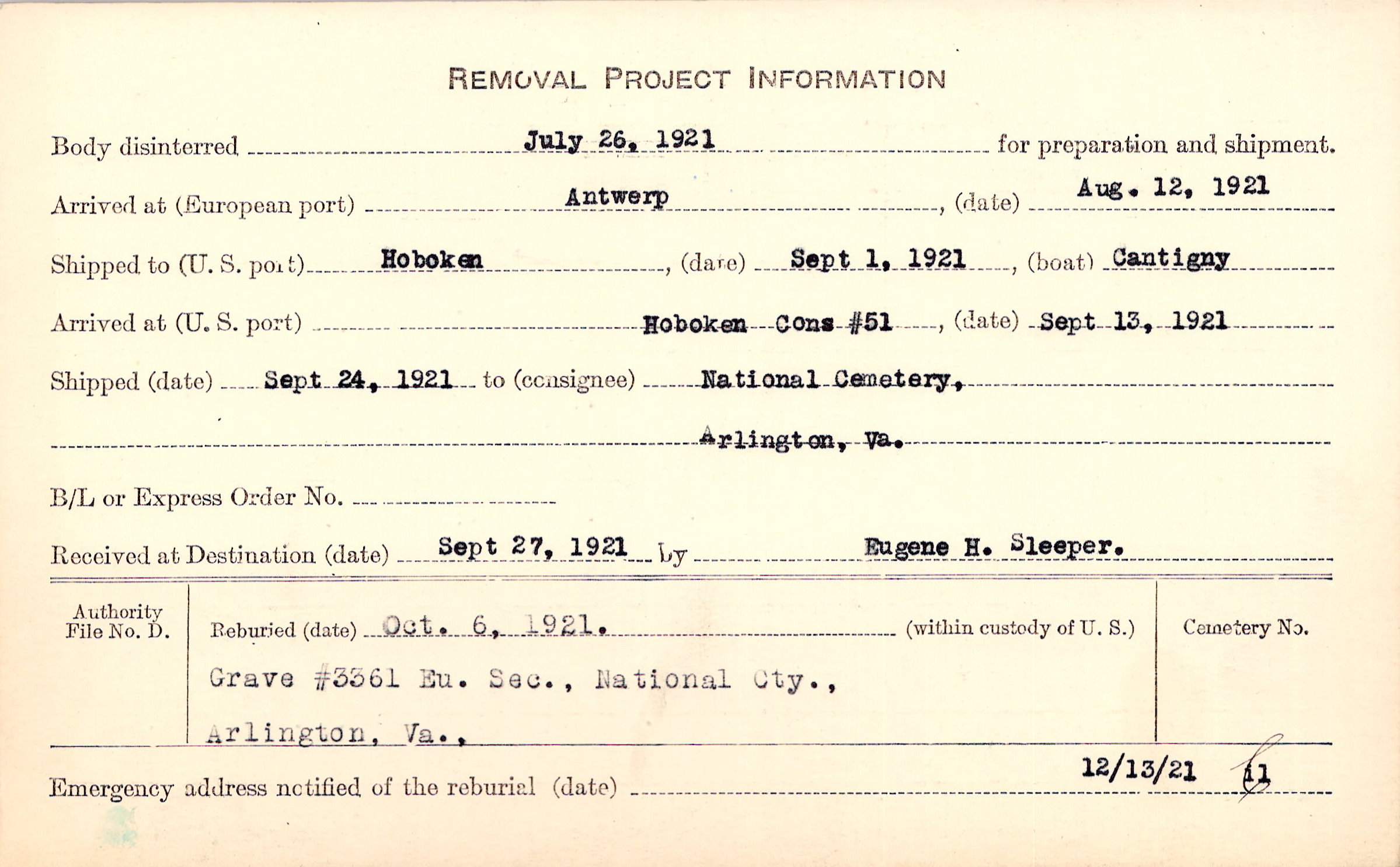 Body disinterred 7/26/1921 for preparation and shipment.