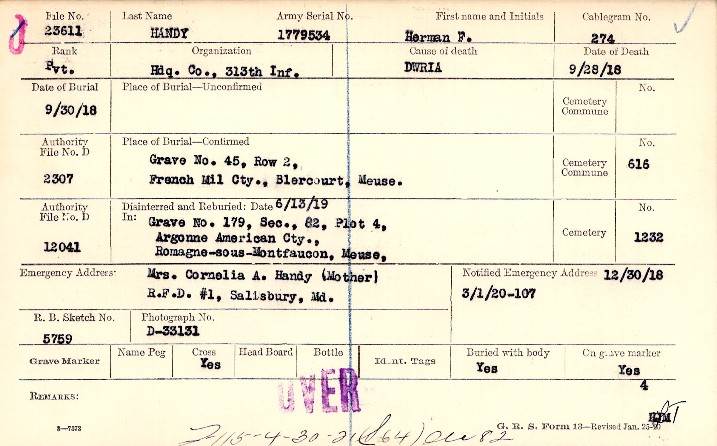 Mrs. Cornelia A. Handy (Mother), R.F.D. #1, Salisbury, Md.