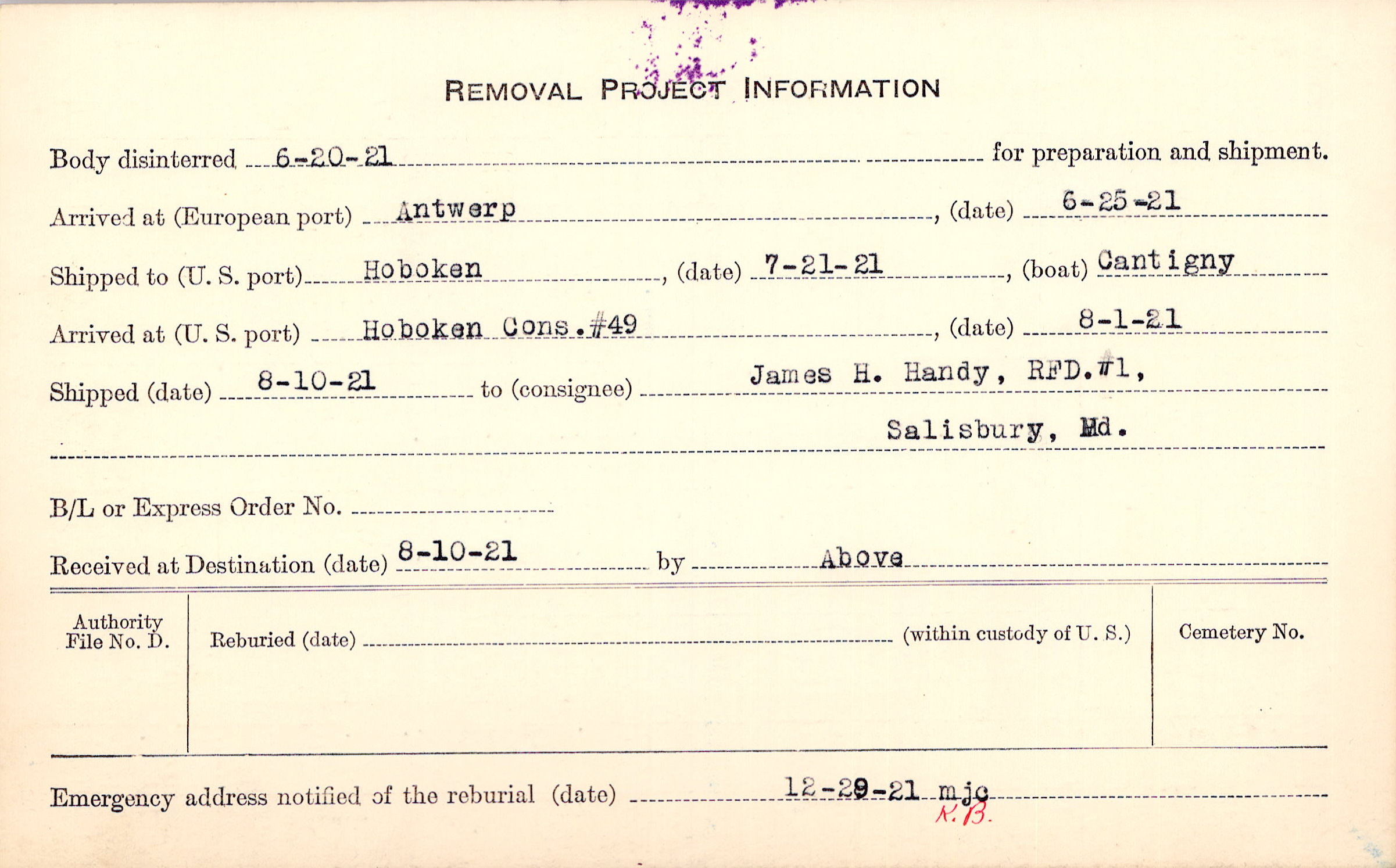 Body disinterred 6/20/1921 for preparation and shipment.