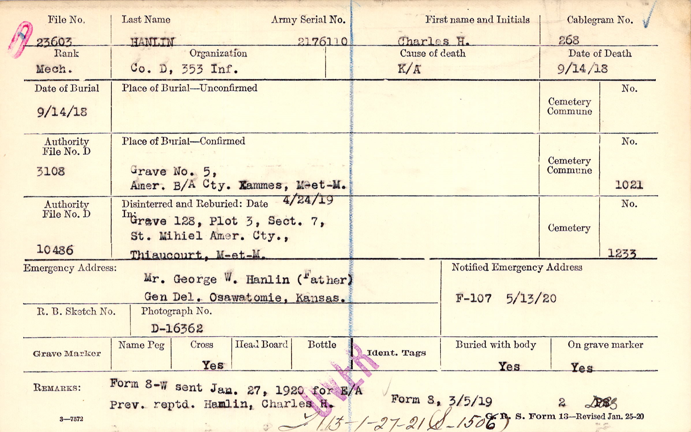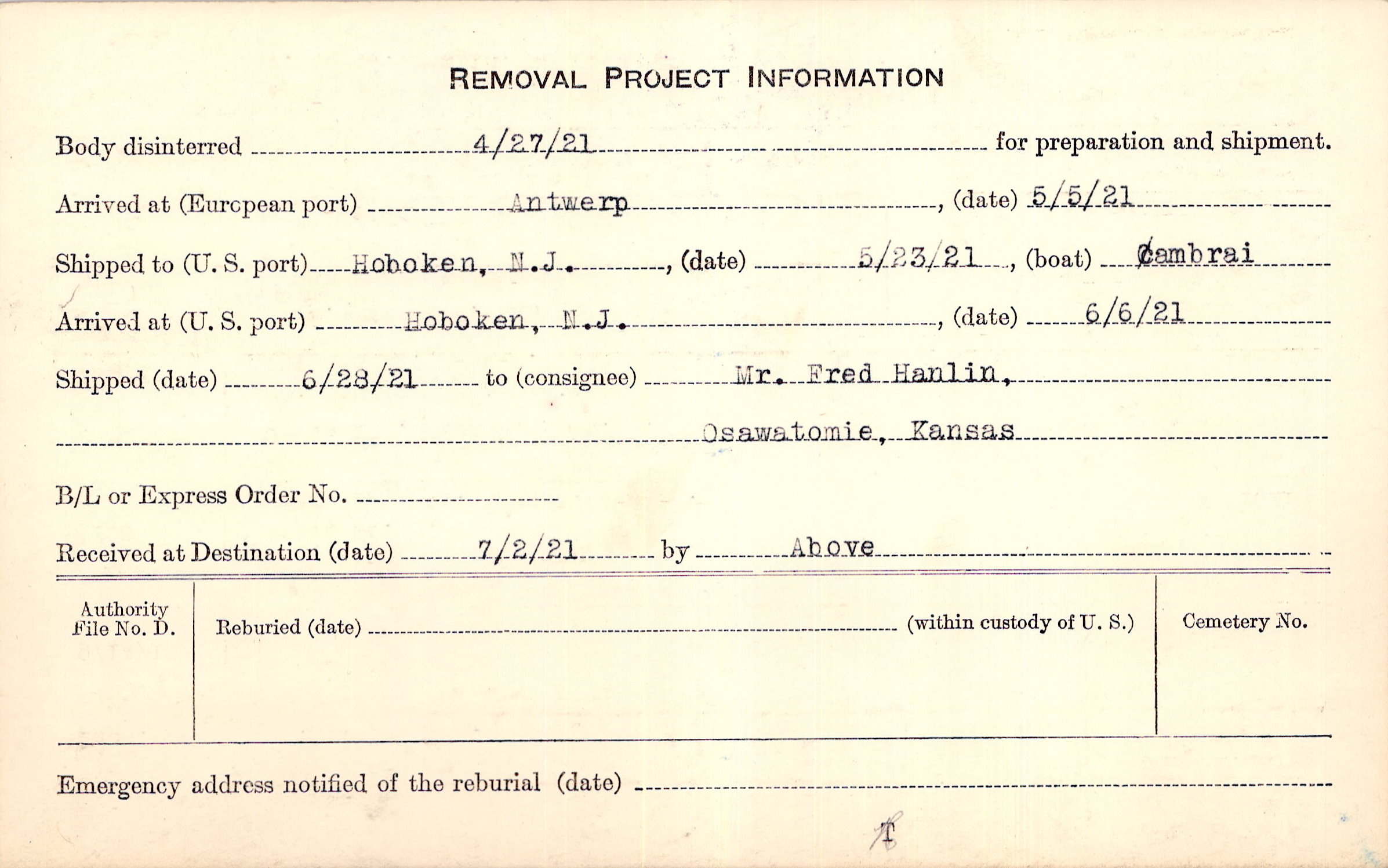 Mr. George W. Hanlin (Father), Gen Del. Osawatomie, Kansas.
