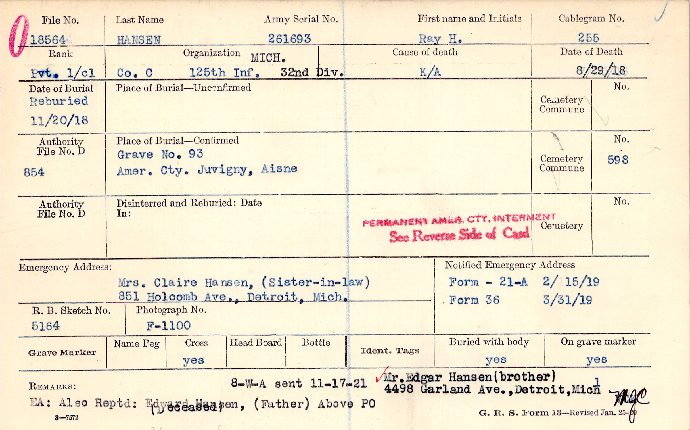 Mrs. Claire Hansen, (Sister-in-law), 851 Holcomb Ave., Detroit, Mich.