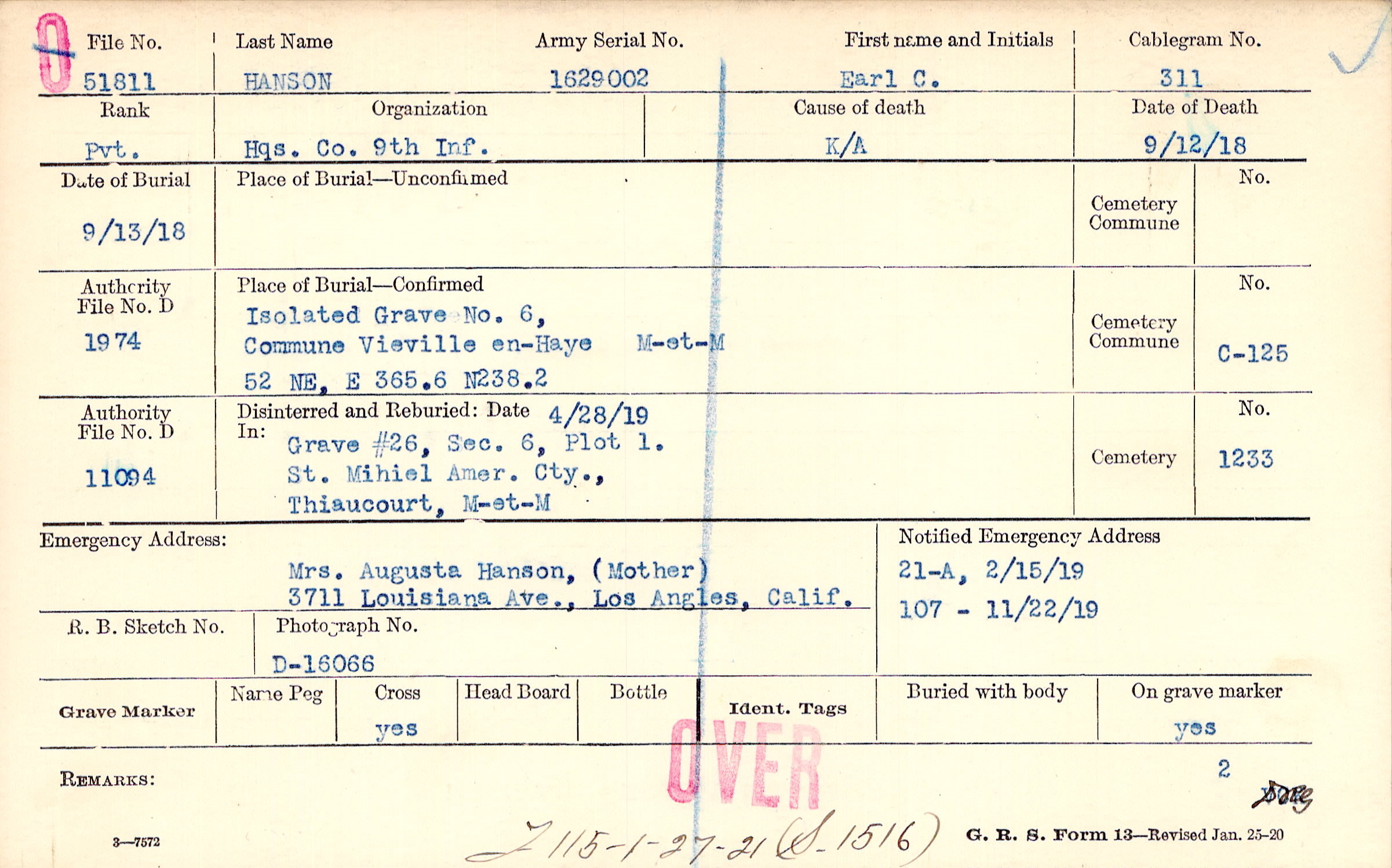 Mrs. Augusta Hanson, (mother), 3711 Louisianna Ave., Los Angeles, Calif.