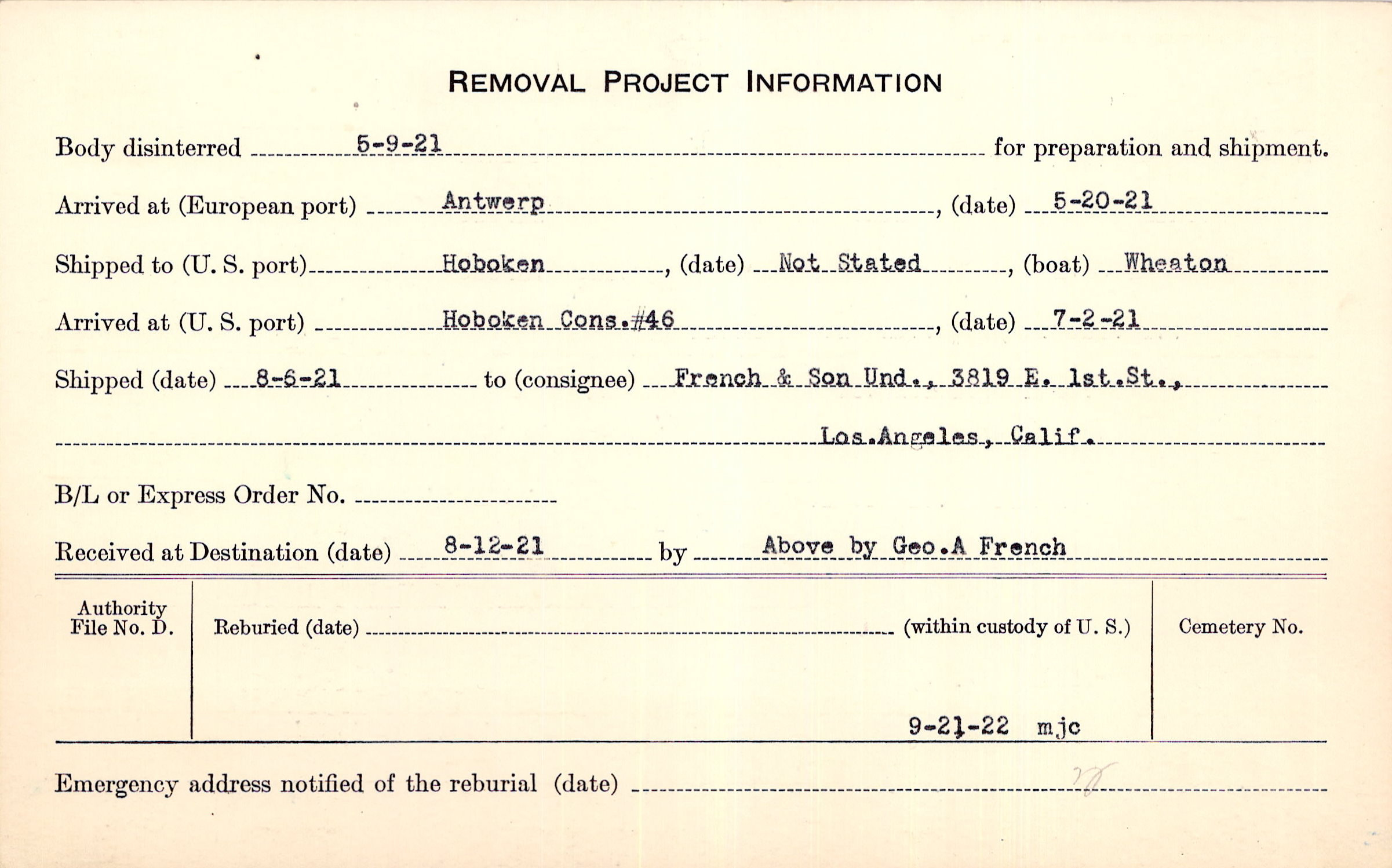 Body disinterred 5/9/1921 for preparation and shipment.