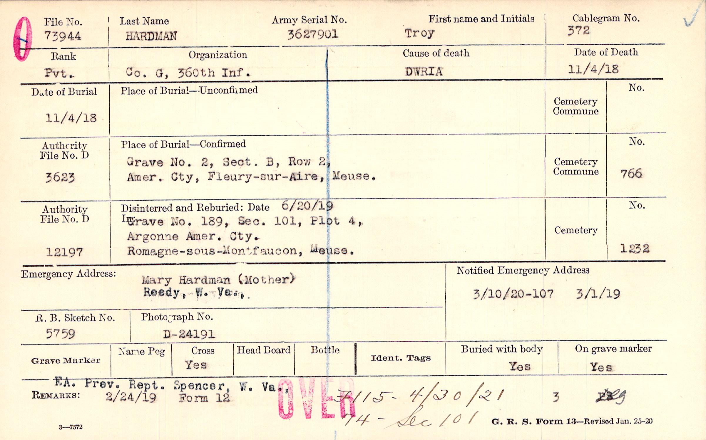 to Mrs. Mary E Hardman, Reedy, W.Va.