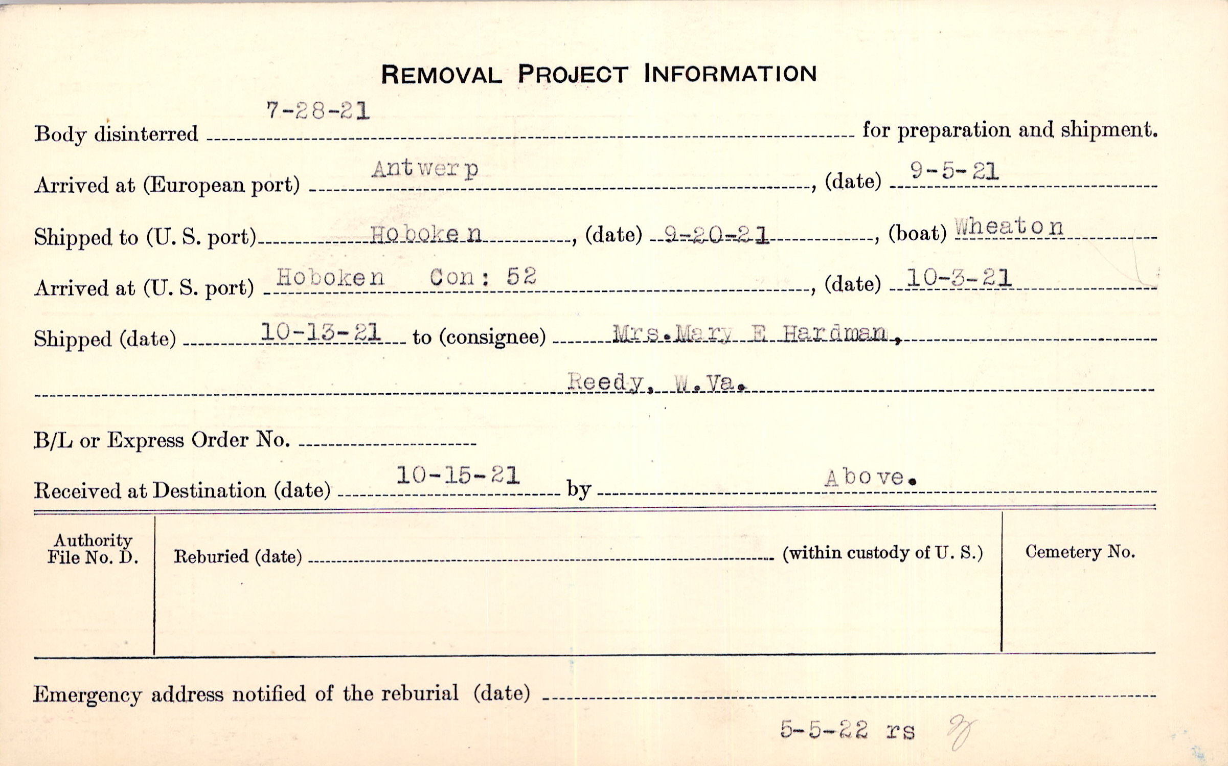 Body disinterred 7/28/1921 for preparation and shipment.