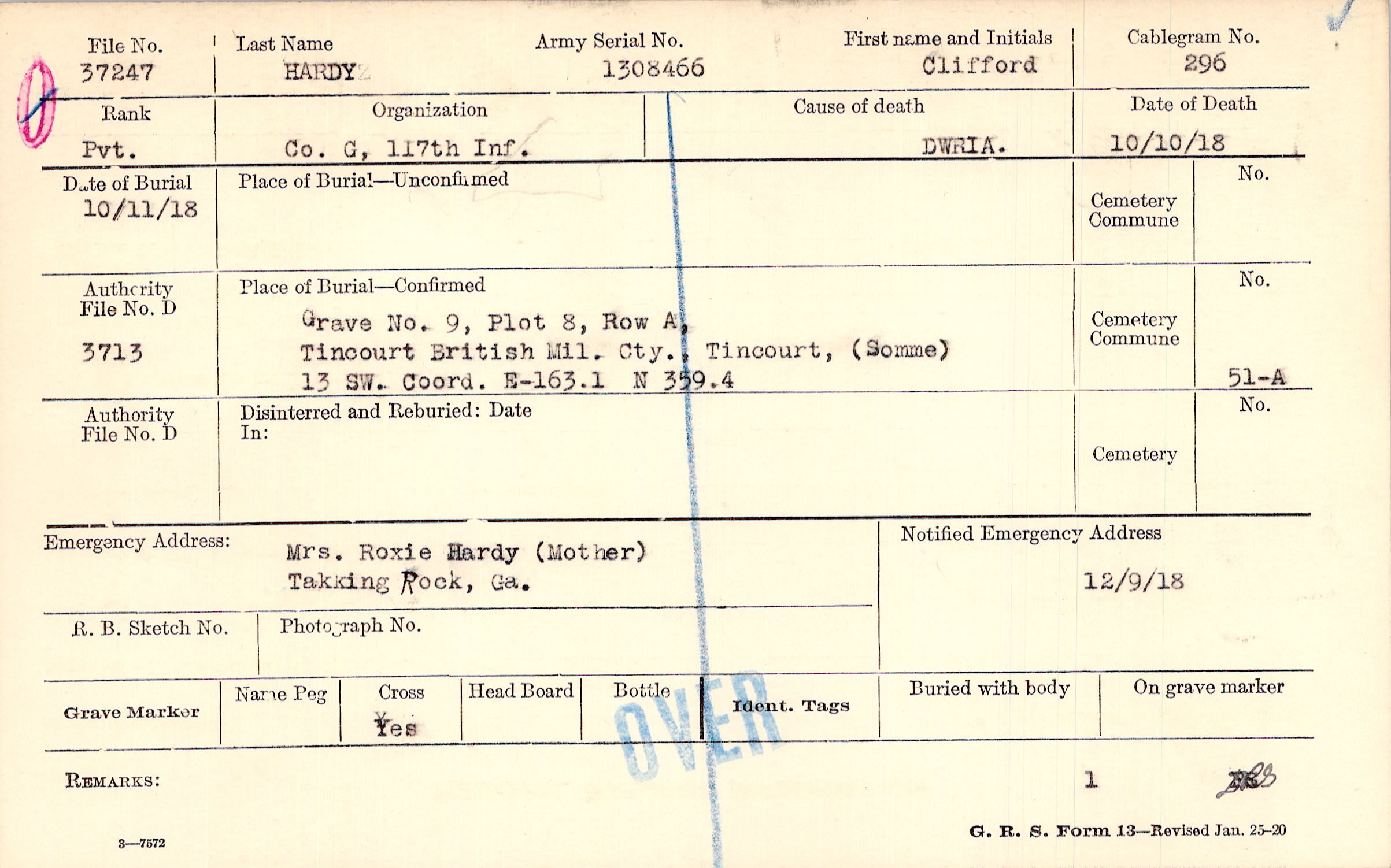 Grave 9, Plot 8, Row A, Tincourt British Mil. Cty., Tincourt, Somme, 13 SW.