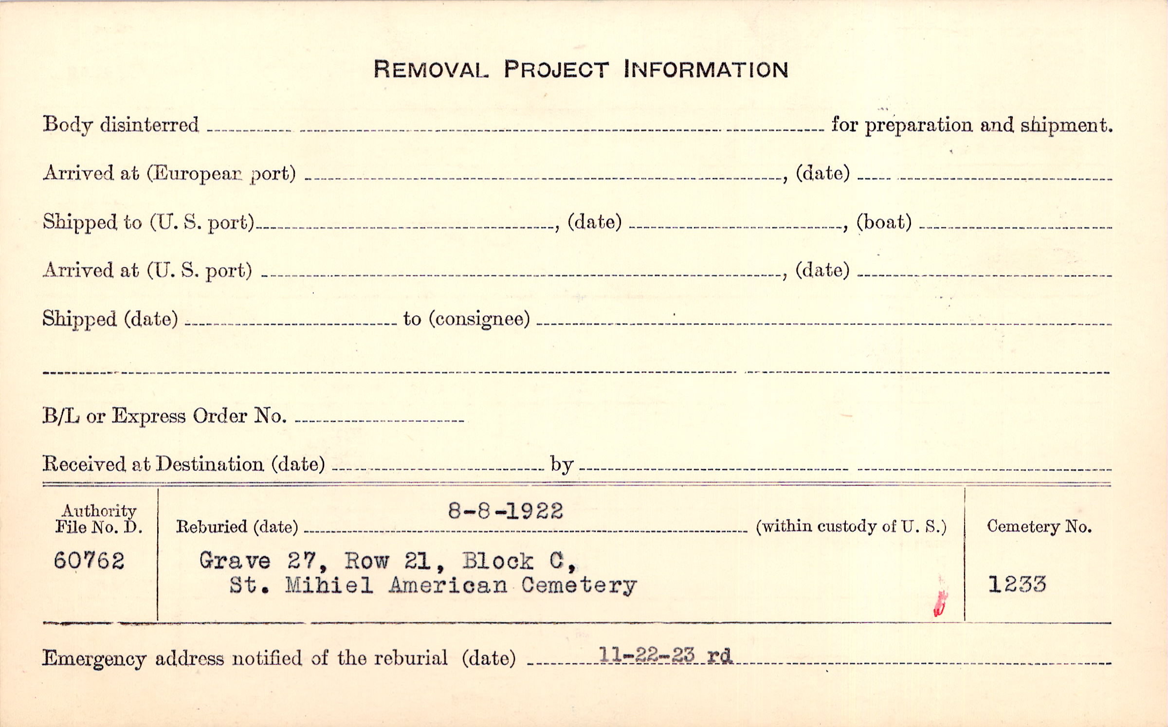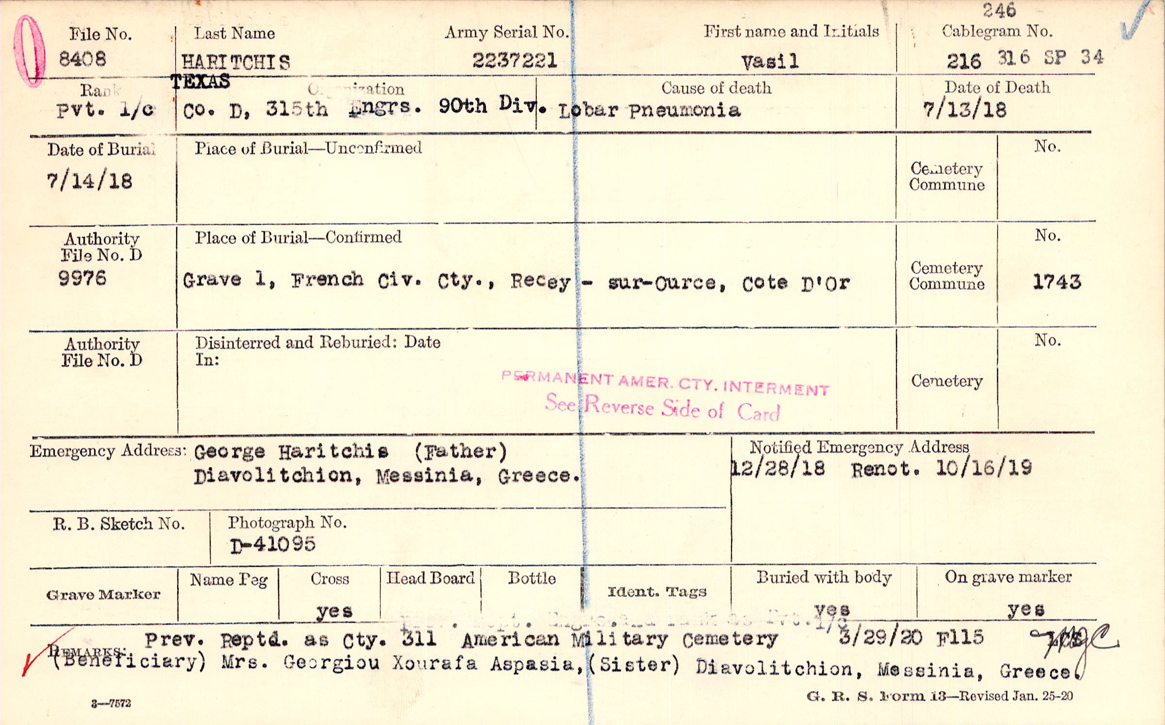 Prev. Reptd. as Cty. 311 American Military Cemetery (Beneficiary) Mrs. Georgiou Xourafa Aspasia, (Sister) Diavolitchion, Messinia, Greece.