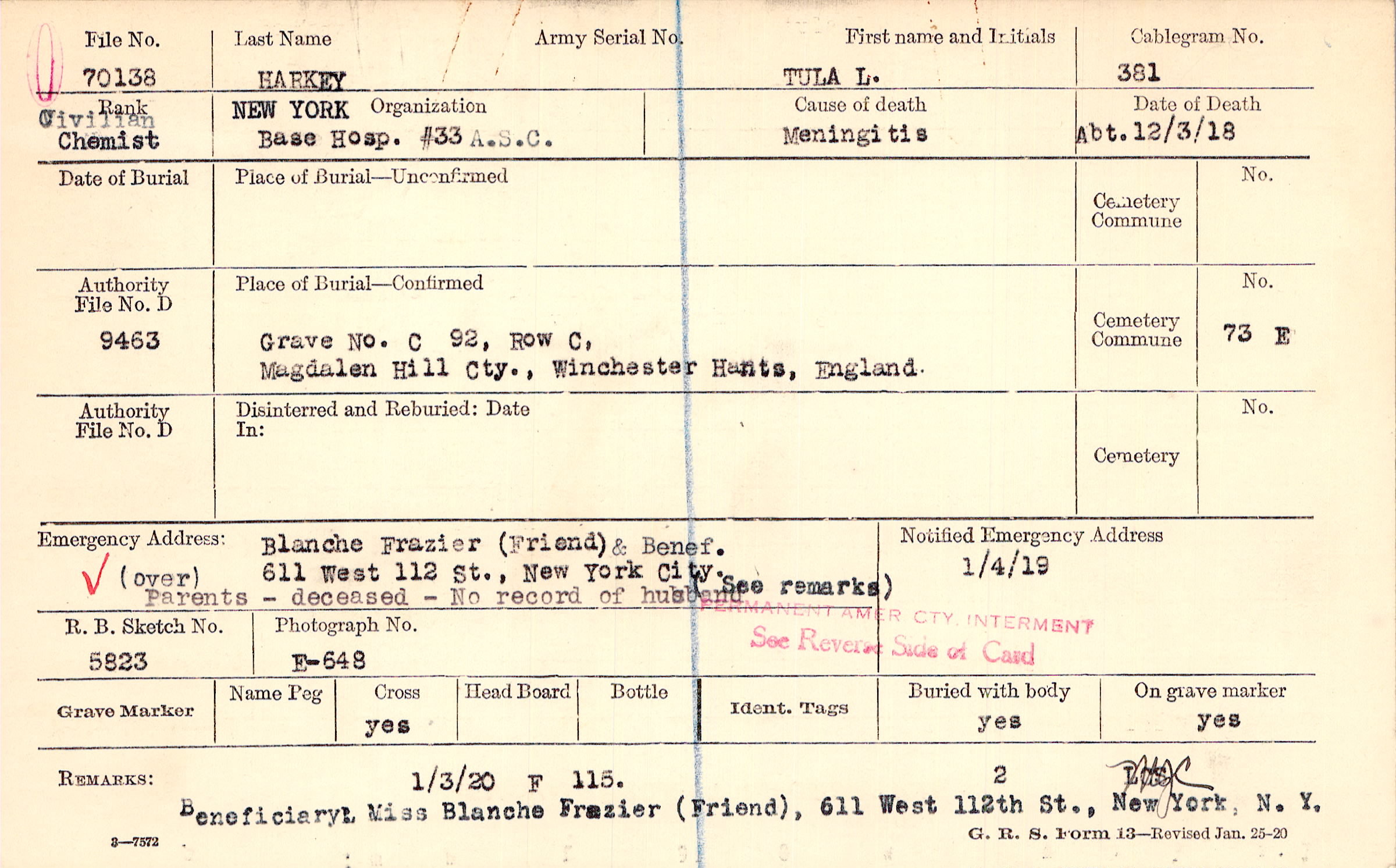 Blanche Frazier (Friend), 611 West 112 St., New York City., & Benef. (over) Parents - deceased - No record of husband (See remarks)