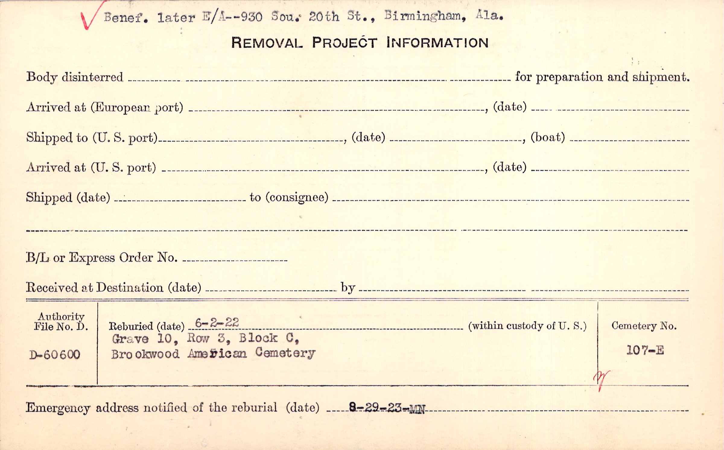 Benef. later E/A -- 930 Sou. 20th St., Birmingham, Ala. |