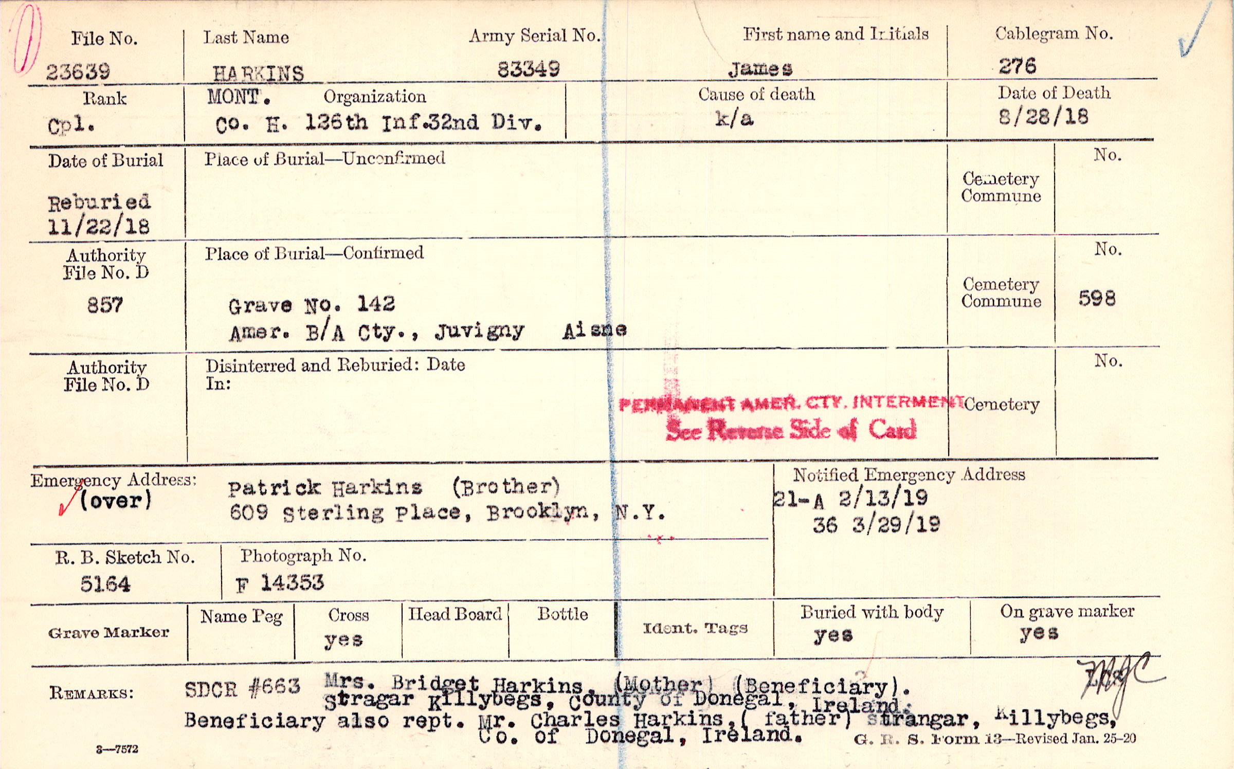 Patrick Harkins (Brother), 609 Sterling Place, Brooklyn, N.Y., (over)