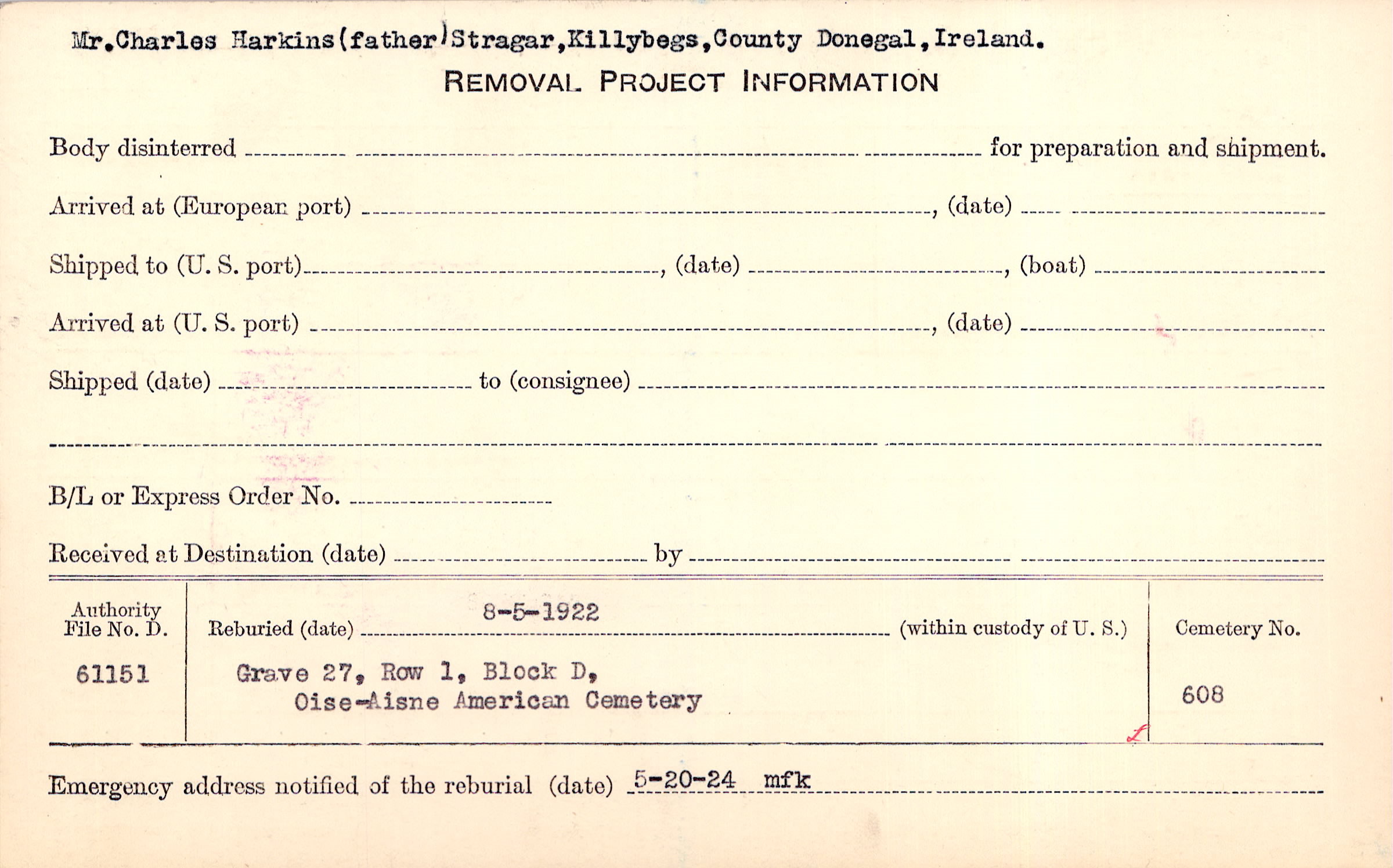 Mr. Charles Harkins (father), Stragar, Killybegs, County Donegal, Ireland |
