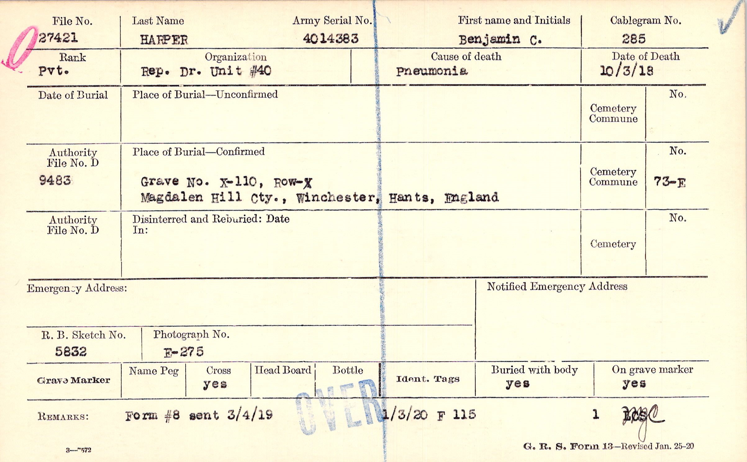Grave X-110, Row-X, Magdalen Hill Cty., Winchester, Hants, England