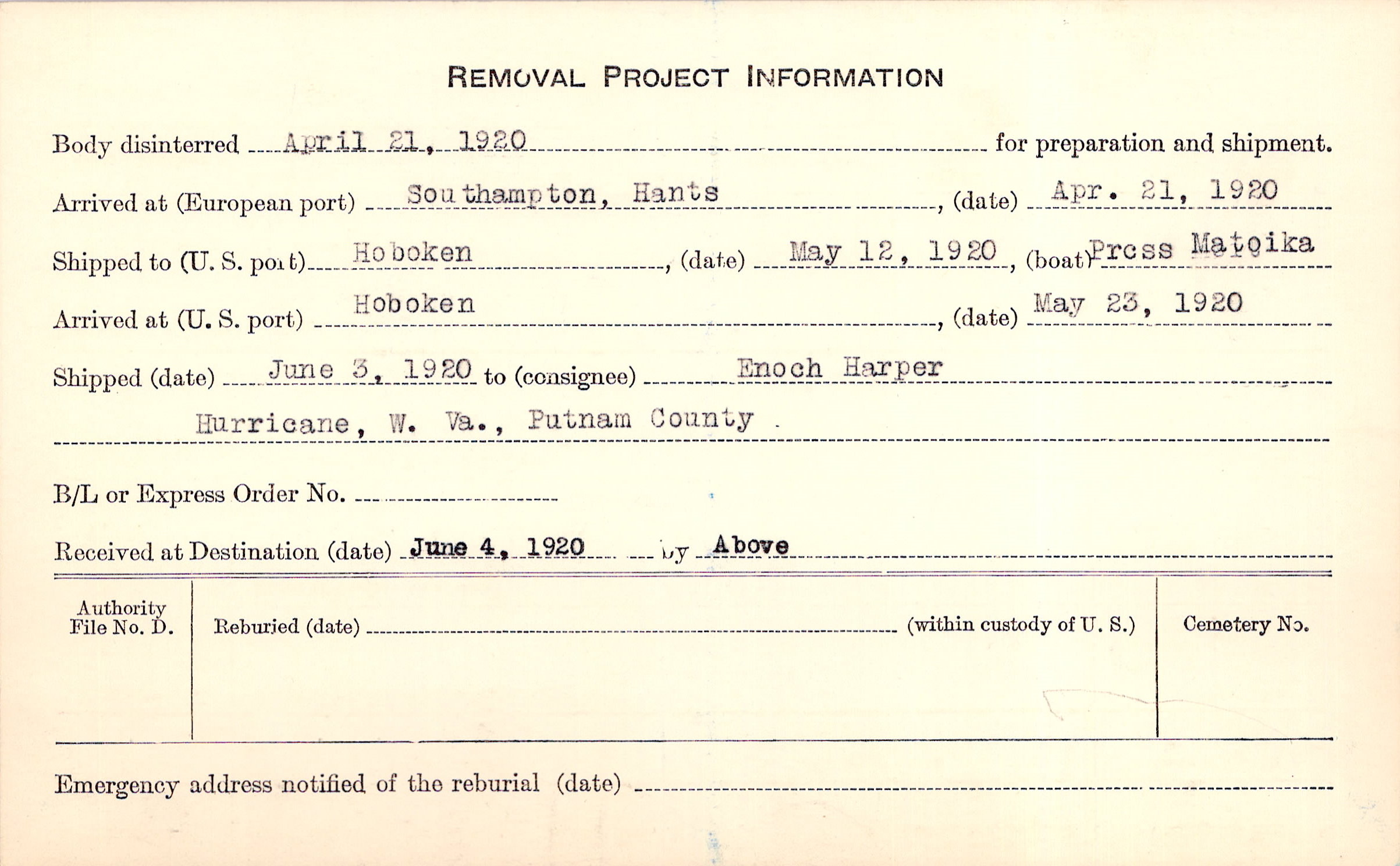 Body disinterred 4/21/1920 for preparation and shipment.