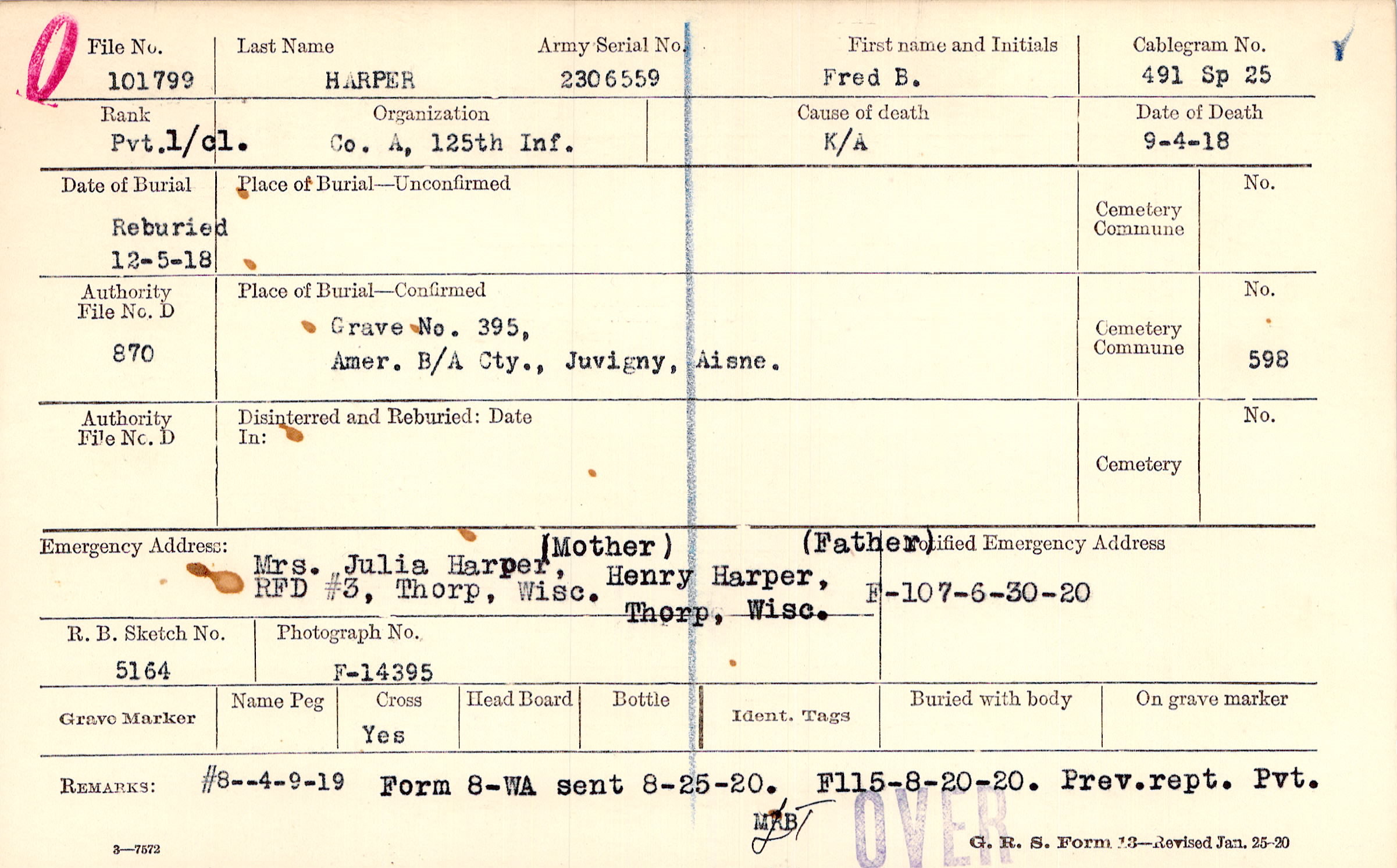 Mrs. Julia Harper, (Mother), RFD #3, Thorp, Wisc., Henry Harper, (Father) Thorp, Wisc.