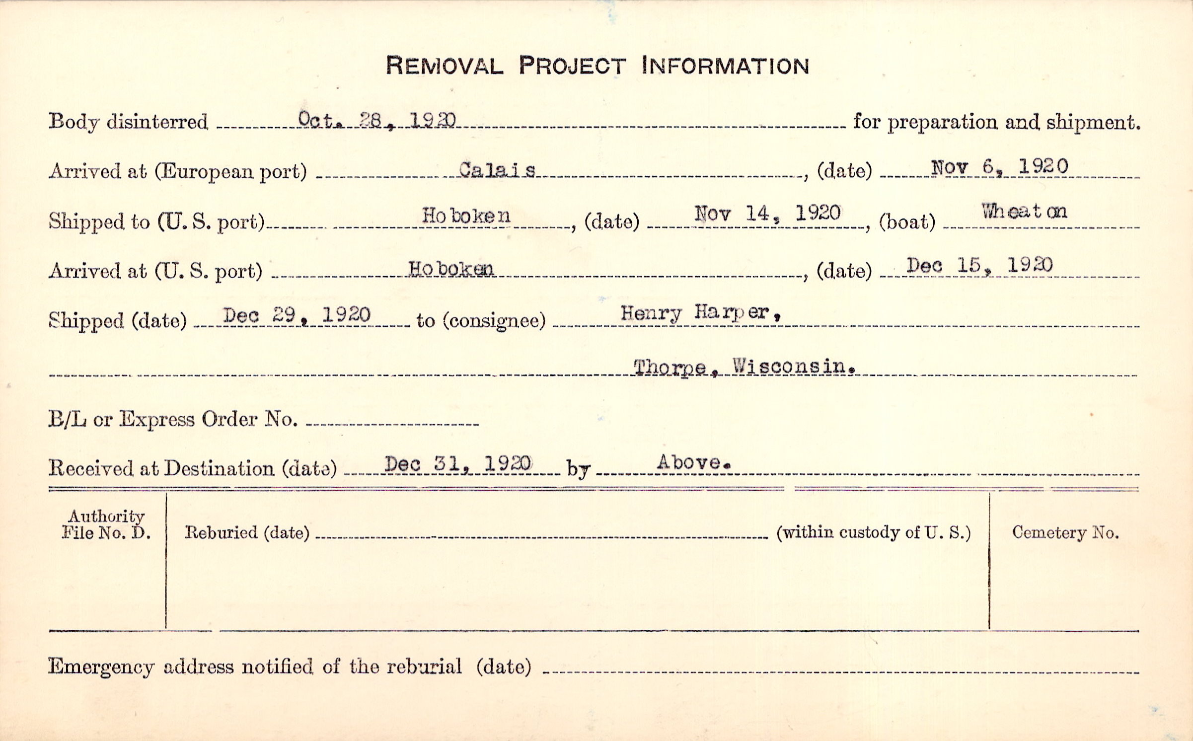 Body disinterred 10/28/1920 for preparation and shipment.