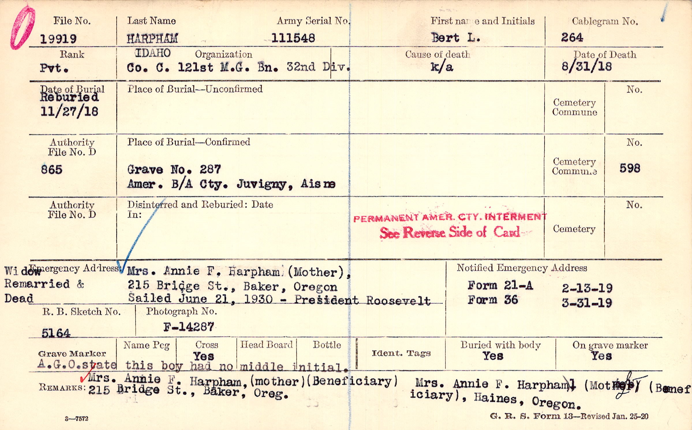 Mrs. Annie F. Harpham, (mother) (Beneficiary), 215, Bridge St., Baker, Oreg. Mrs. Annie F. Harpham, (Mother) (Beneficiary), Haines, Oregon