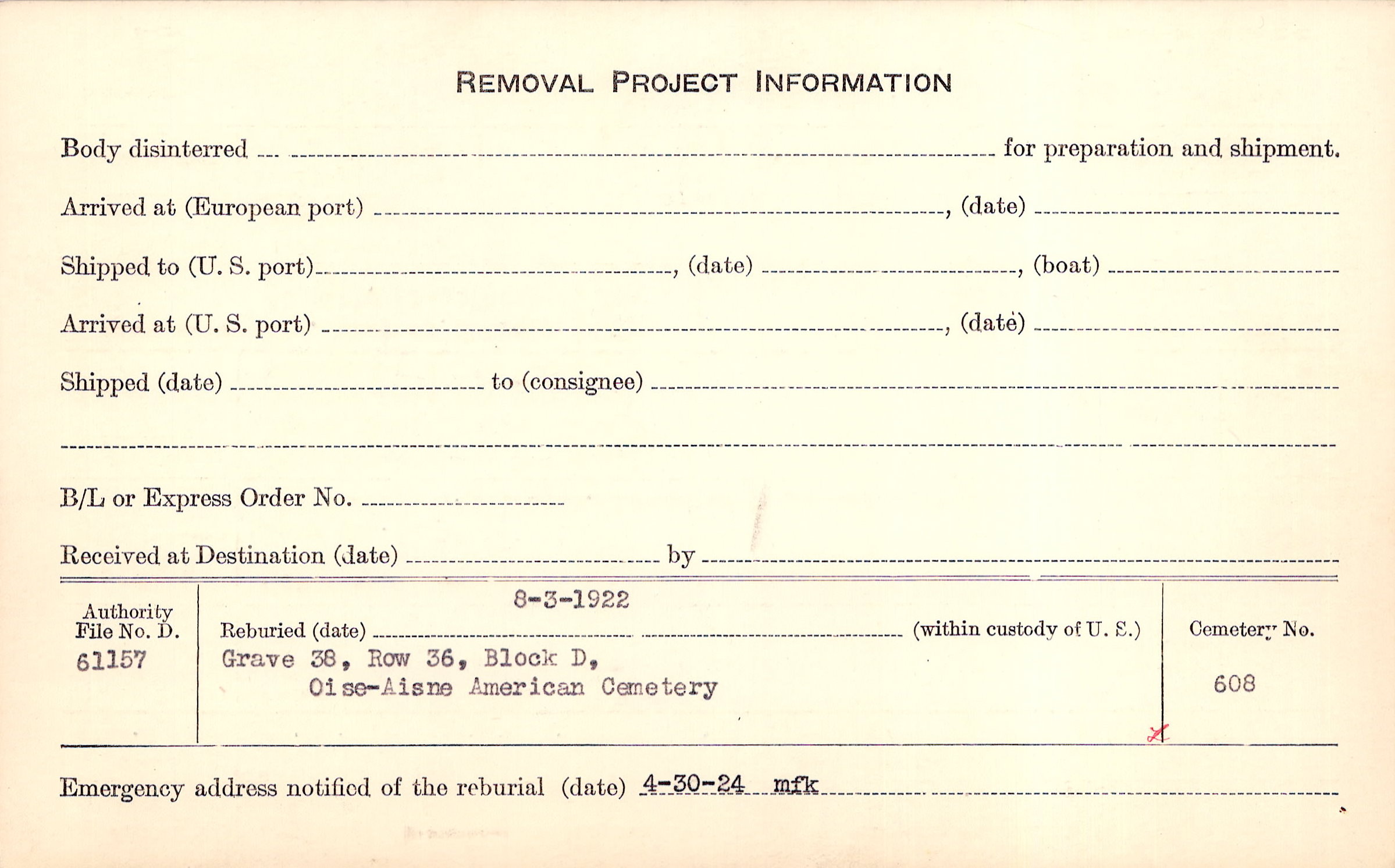 Grave #287, Amer. B/A Cty., Juvigny, Aisne.