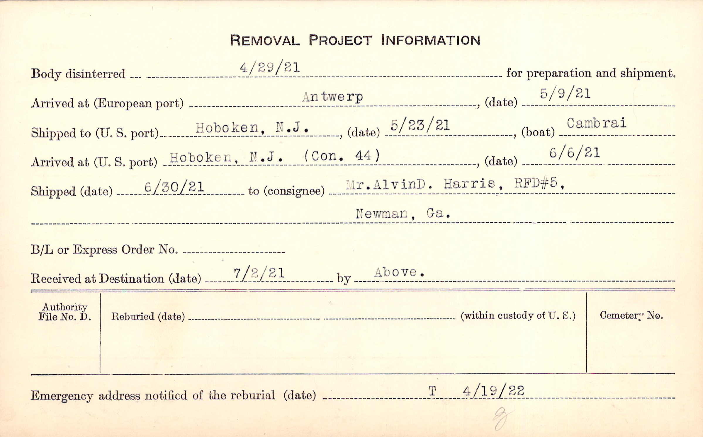 Body disinterred 4/29/1921 for preparation and shipment.