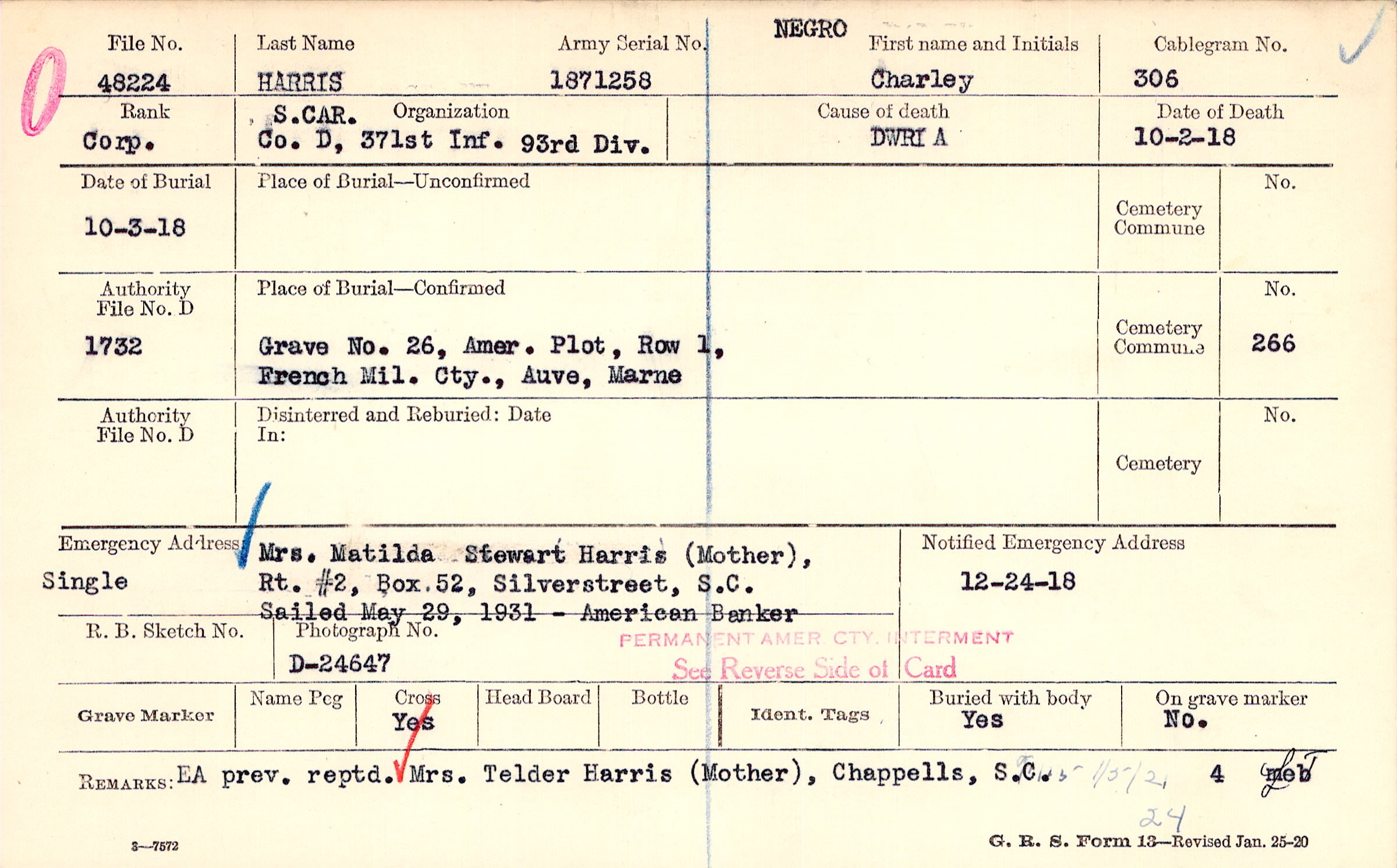 Mrs. Matilda Stewart Harris (Mother),, Rt. #2, Box 52, Silverstreet, S.C., Single Sailed May 29, 1931 - American Banker