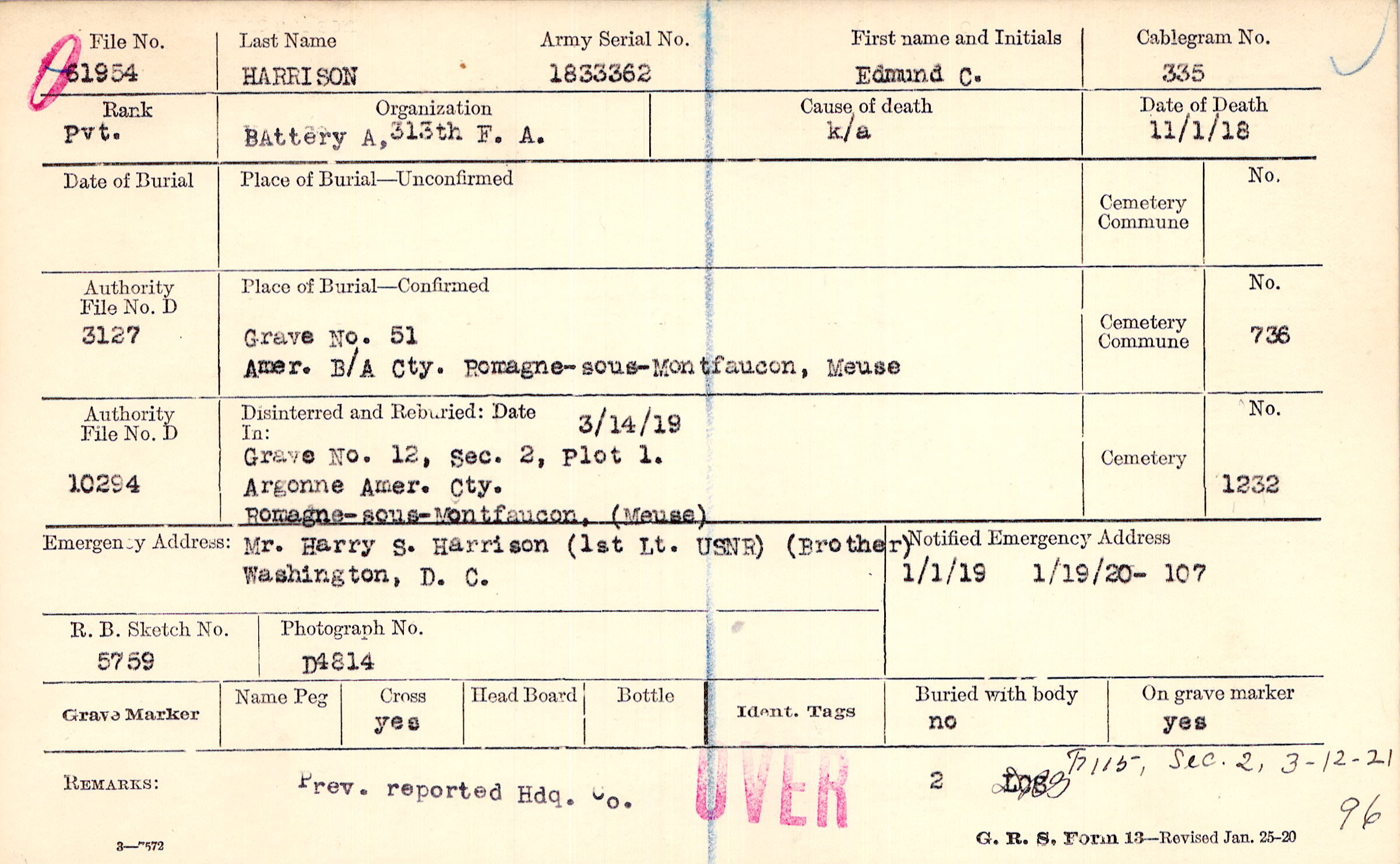 Grave 51, Amer. B/A Cty., Romagne-sous-Montfaucon, Meuse