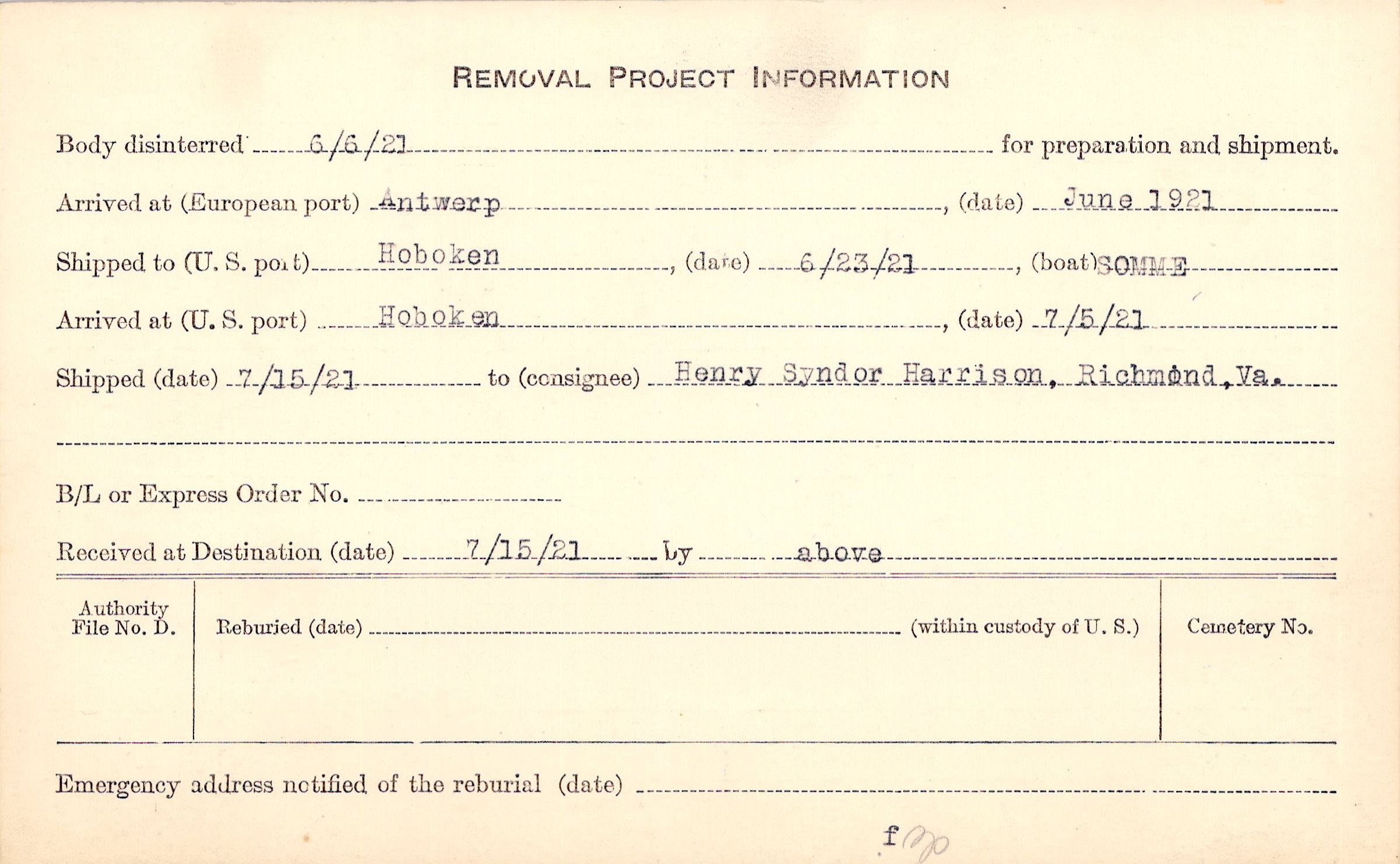 Body disinterred 6/6/1921 for preparation and shipment.