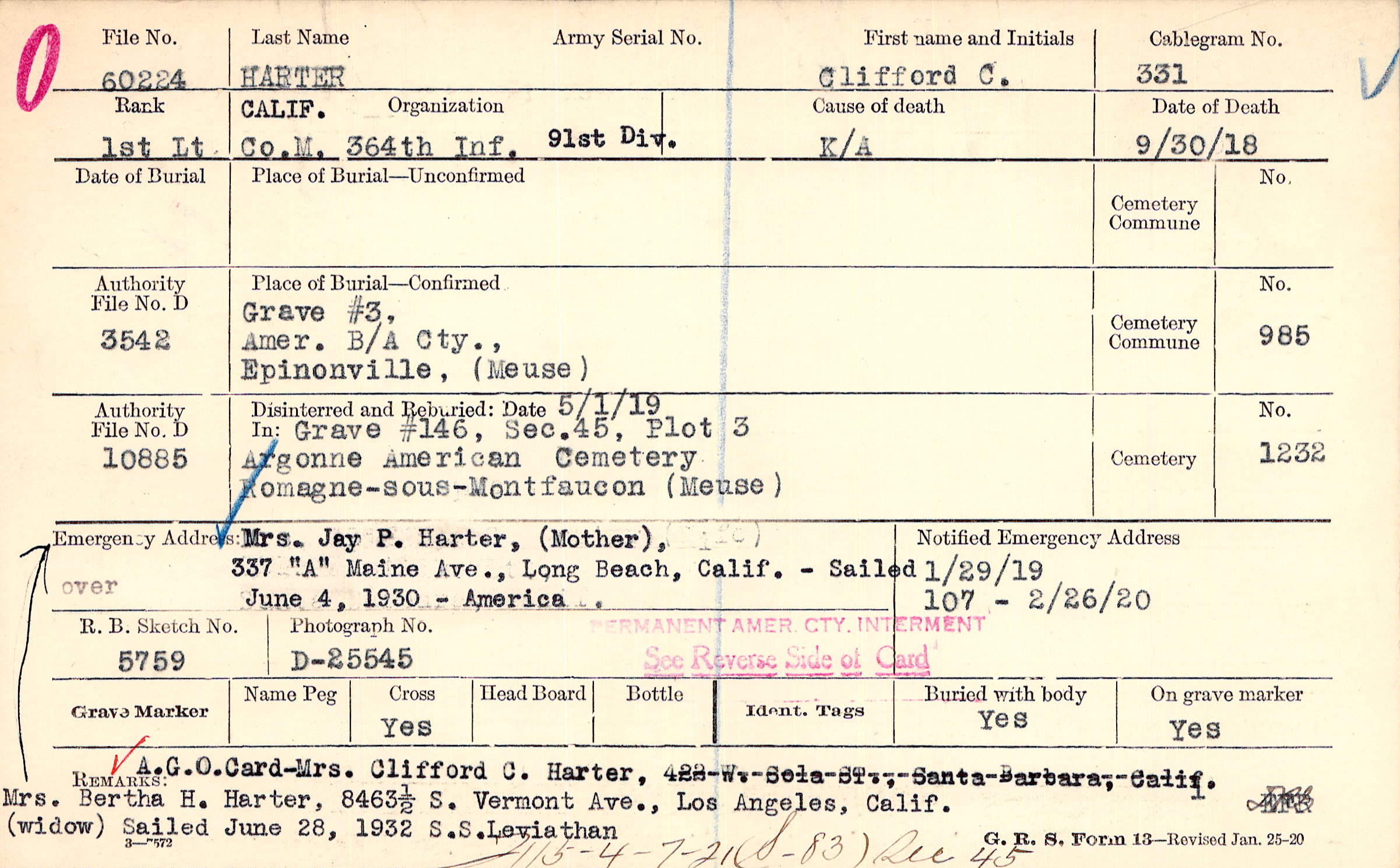 A.G.O. Card-Mrs. Clifford C. Harter, [del]422 W. Sola ST., Santa Barbara, Calif.[/del] Mrs. Bertha H. Harter (widow), 8463 1/2 S. Vermont Ave., Los Angeles, Calif. Sailed June 28, 1932 S.S.Leviathan, 4-7-21(S-83) Sec 45