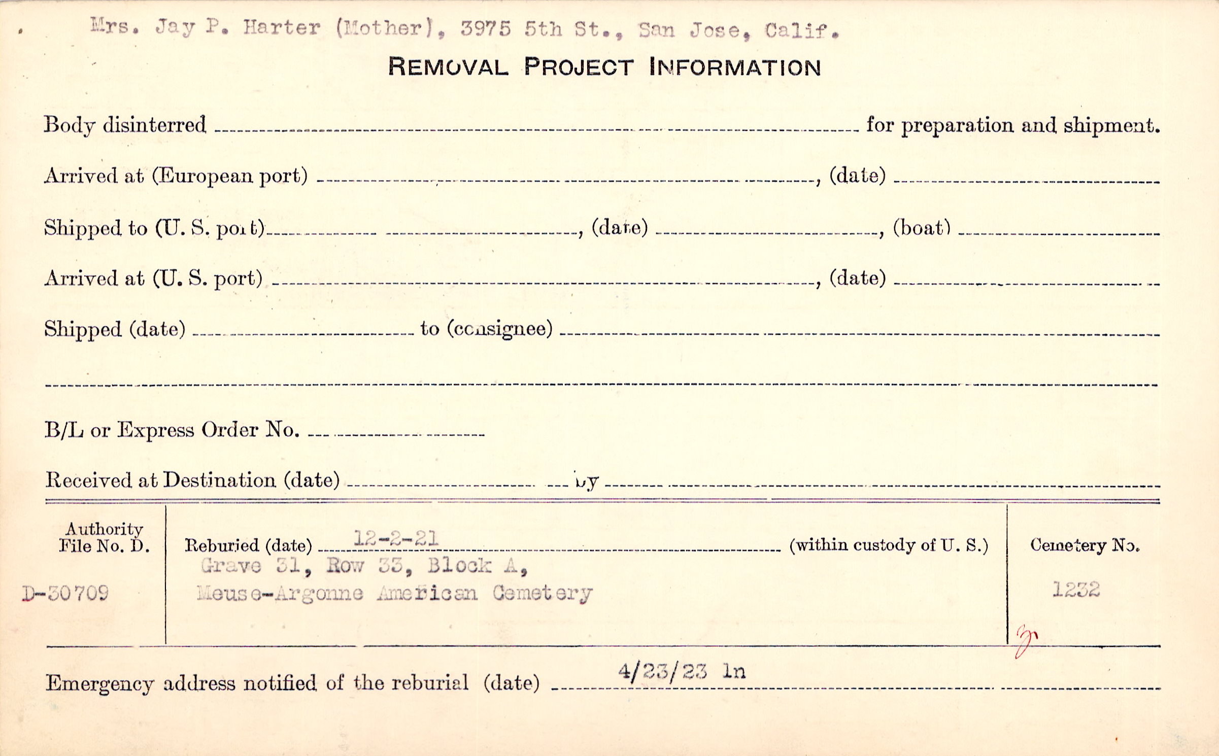 Mrs. Jay P. Harter (Mother), 3975 5th St., San Jose, Calif. |