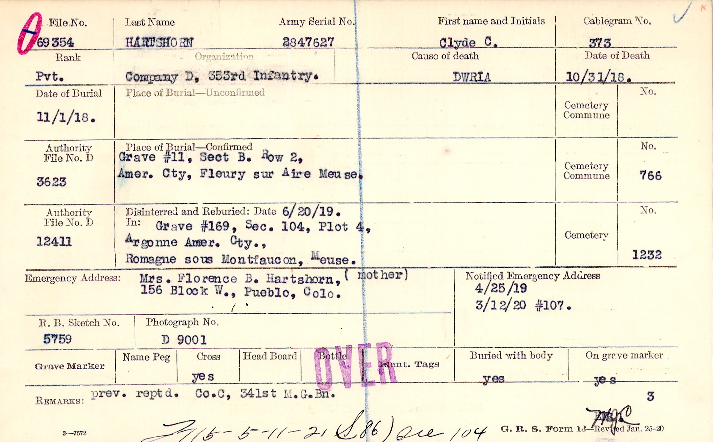 Mrs. Florence B. Hartshorn, ( mother), 156 Block W., Pueblo, Colo.