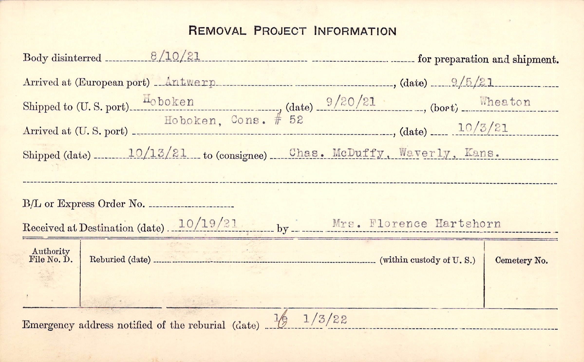 Body disinterred 8/10/1921 for preparation and shipment.