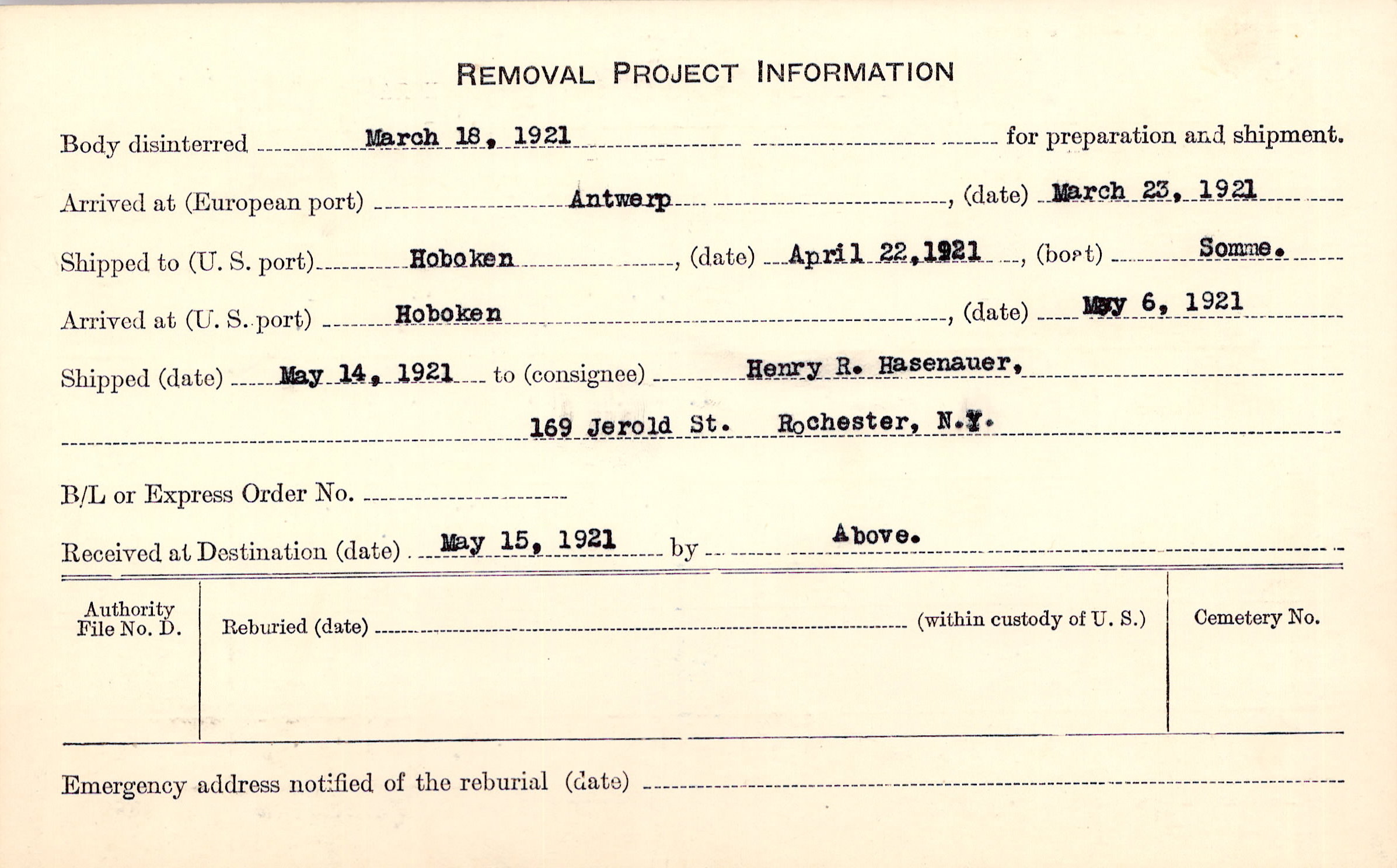 Mr. Henry Hasenauer, (Father), 330-6th St., Rochester, N. Y.