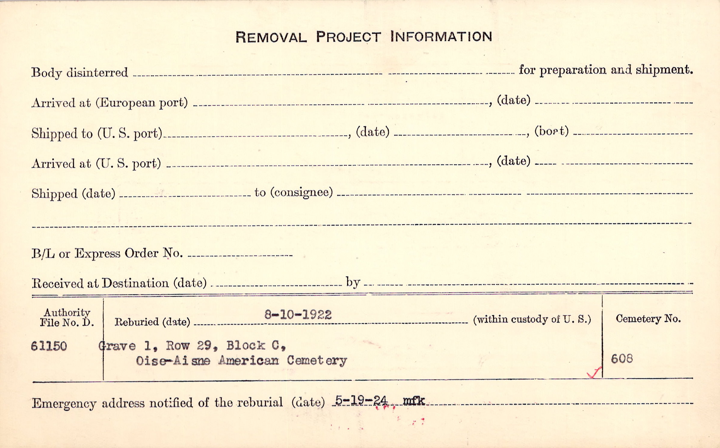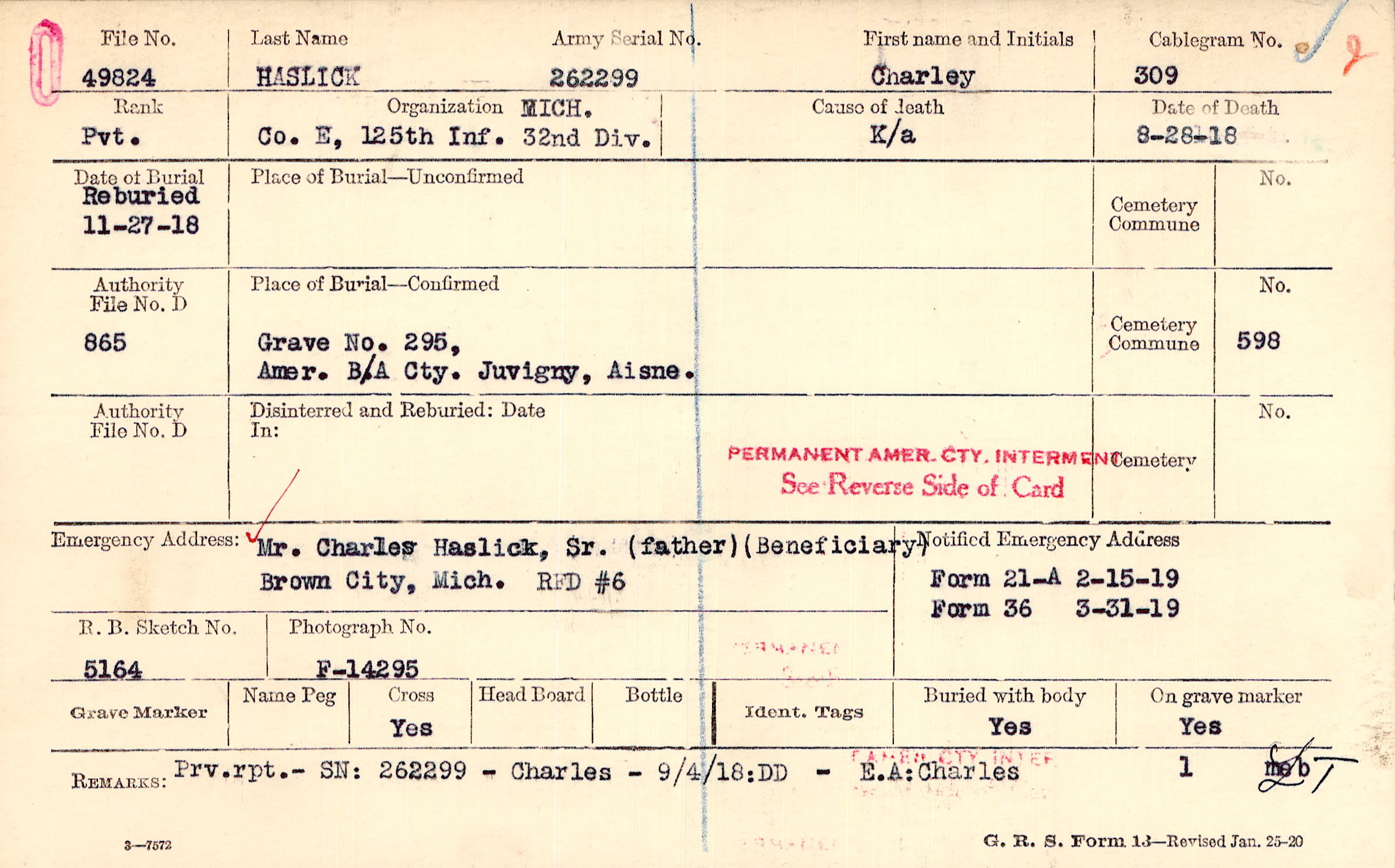 Grave 295, Amer. B/A Cty., Juvigny, Aisne.
