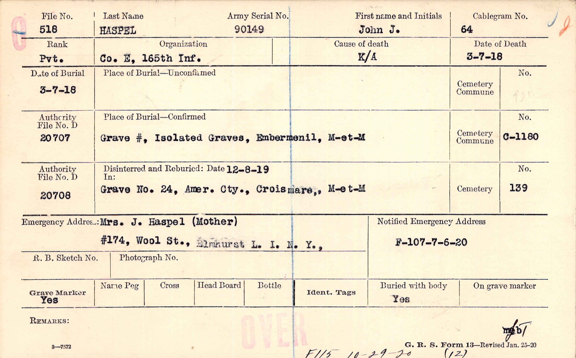 Mrs. J. Haspel (Mother), #174, Wool St., Elmhurst L. I. N. Y.,