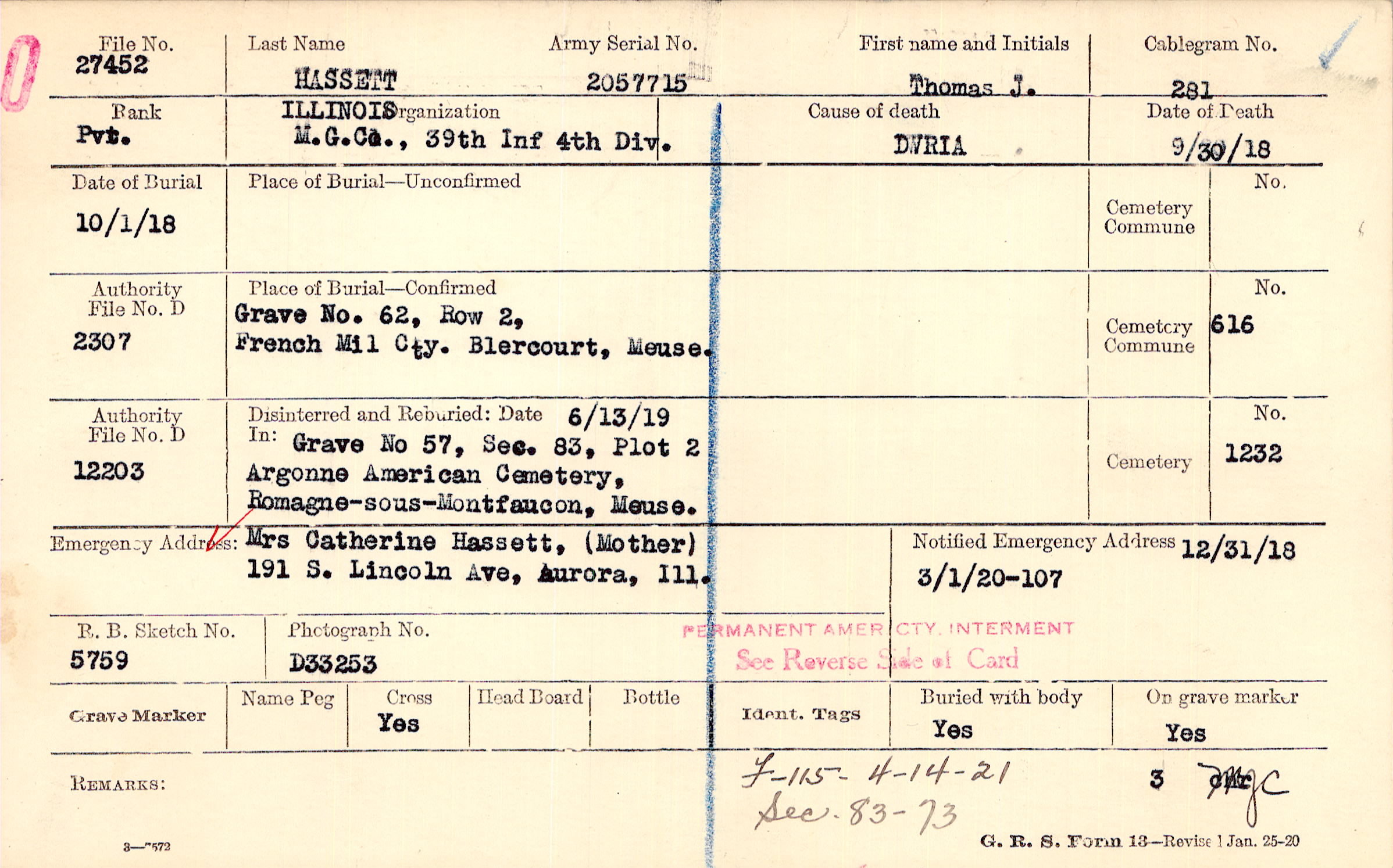 Mrs Catherine Hassett, (Mother), 191 S. Lincoln Ave, Aurora, Ill.