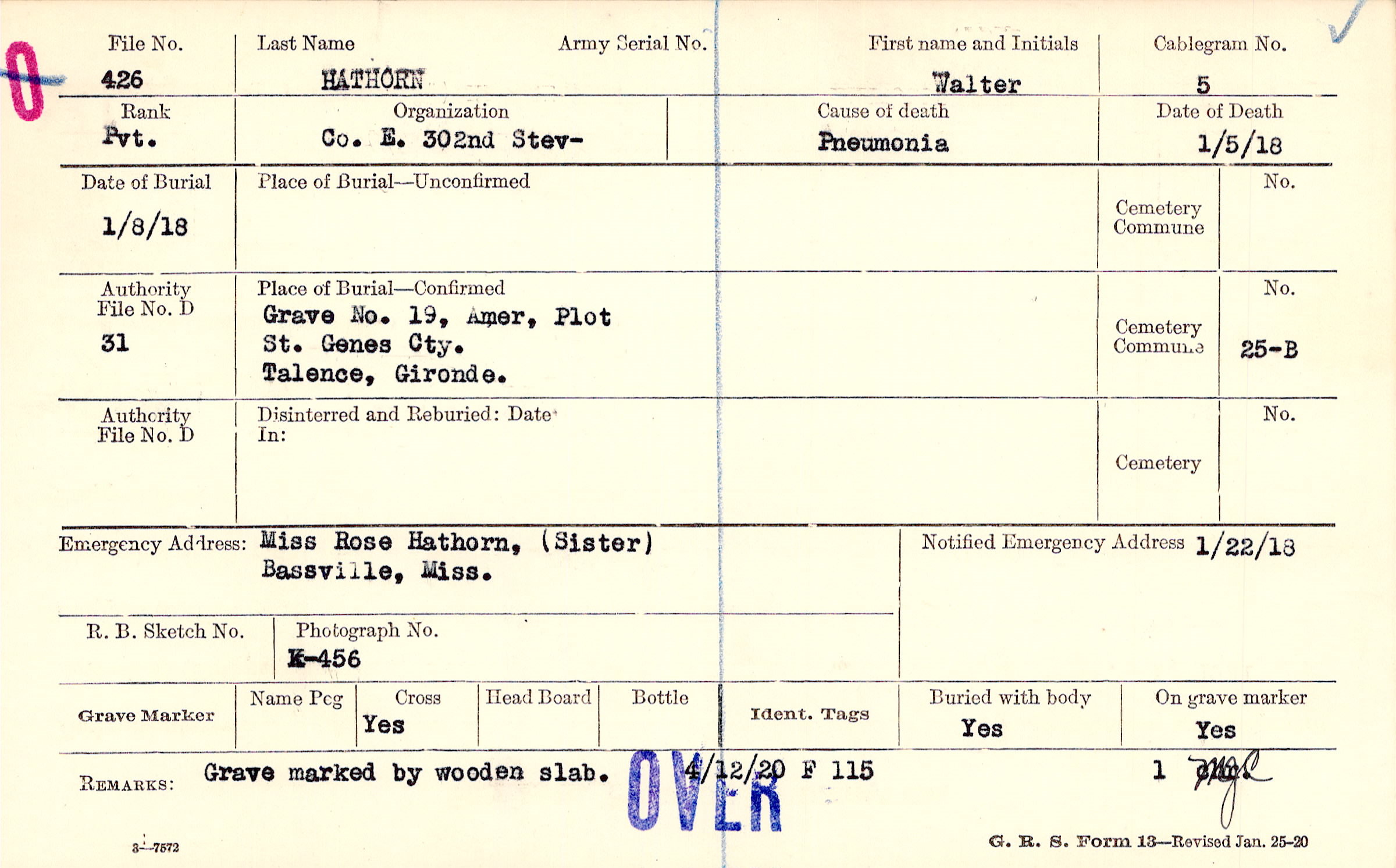 Grave 19, Amer. Plot,St., Genes Cty.,Talence, Gironde.