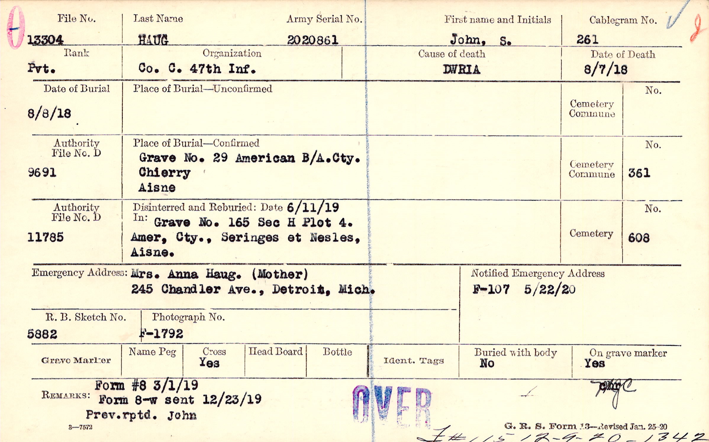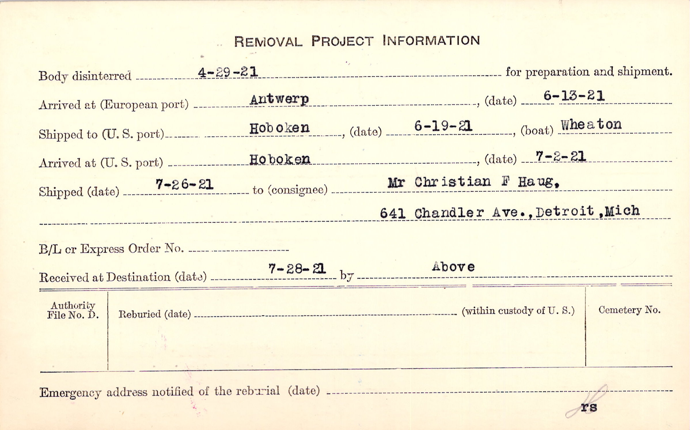 Mrs. Anna Haug. (Mother), 245 Chandler Ave., Detroit, Mich.