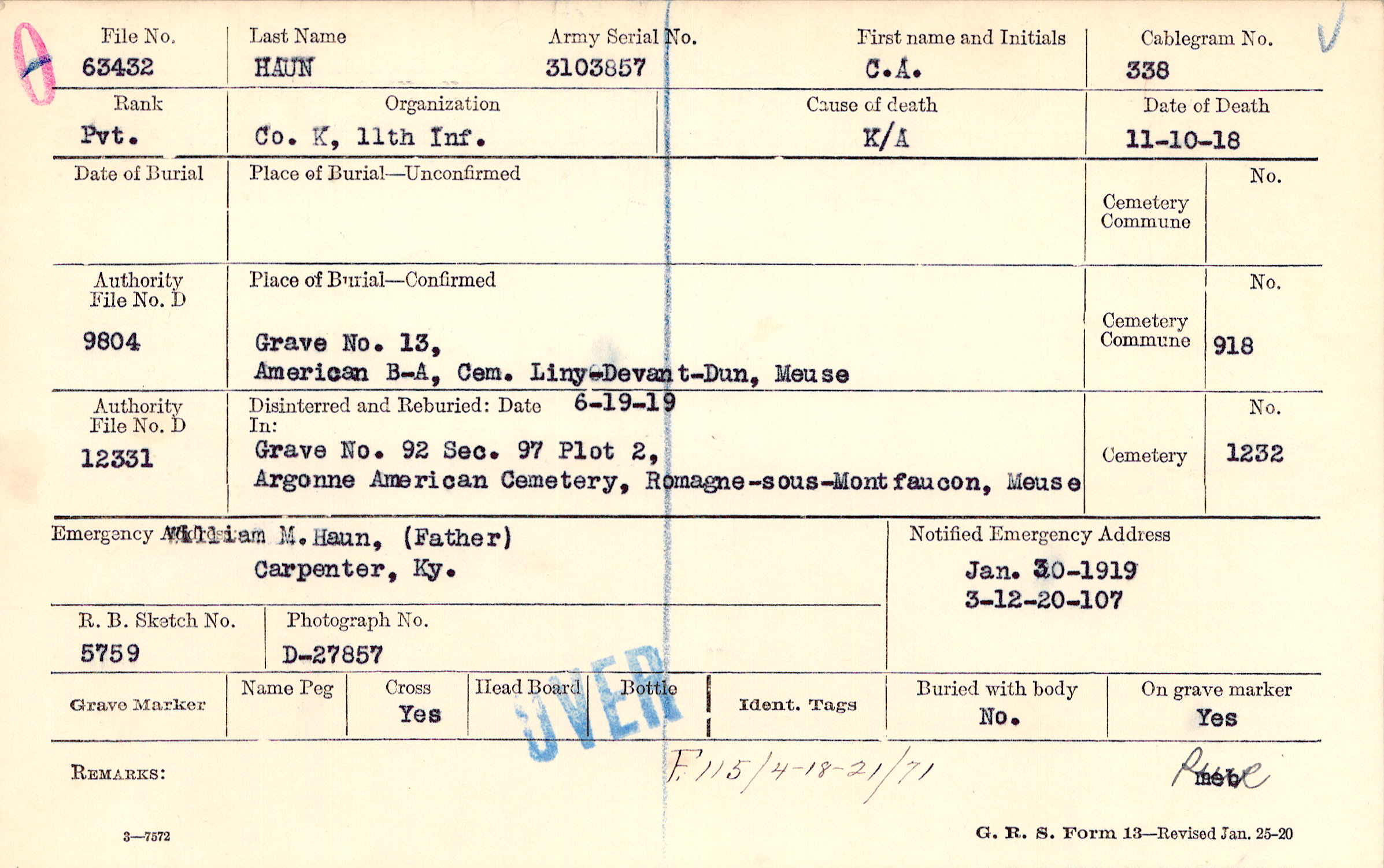 Grave 13, American B-A, Cem. Liny-Devant-Dun, Meuse.