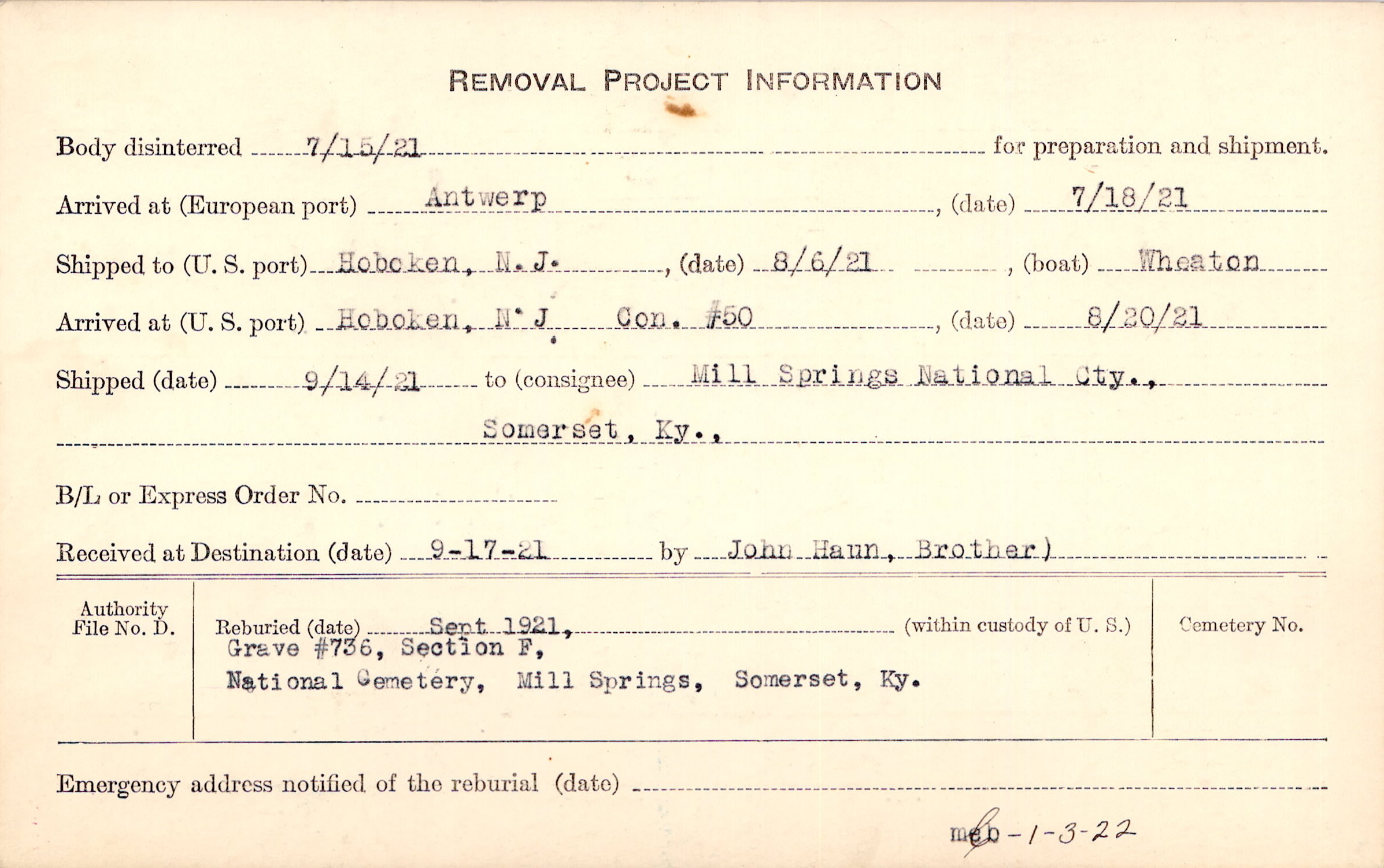 Body disinterred 7/15/1921 for preparation and shipment.