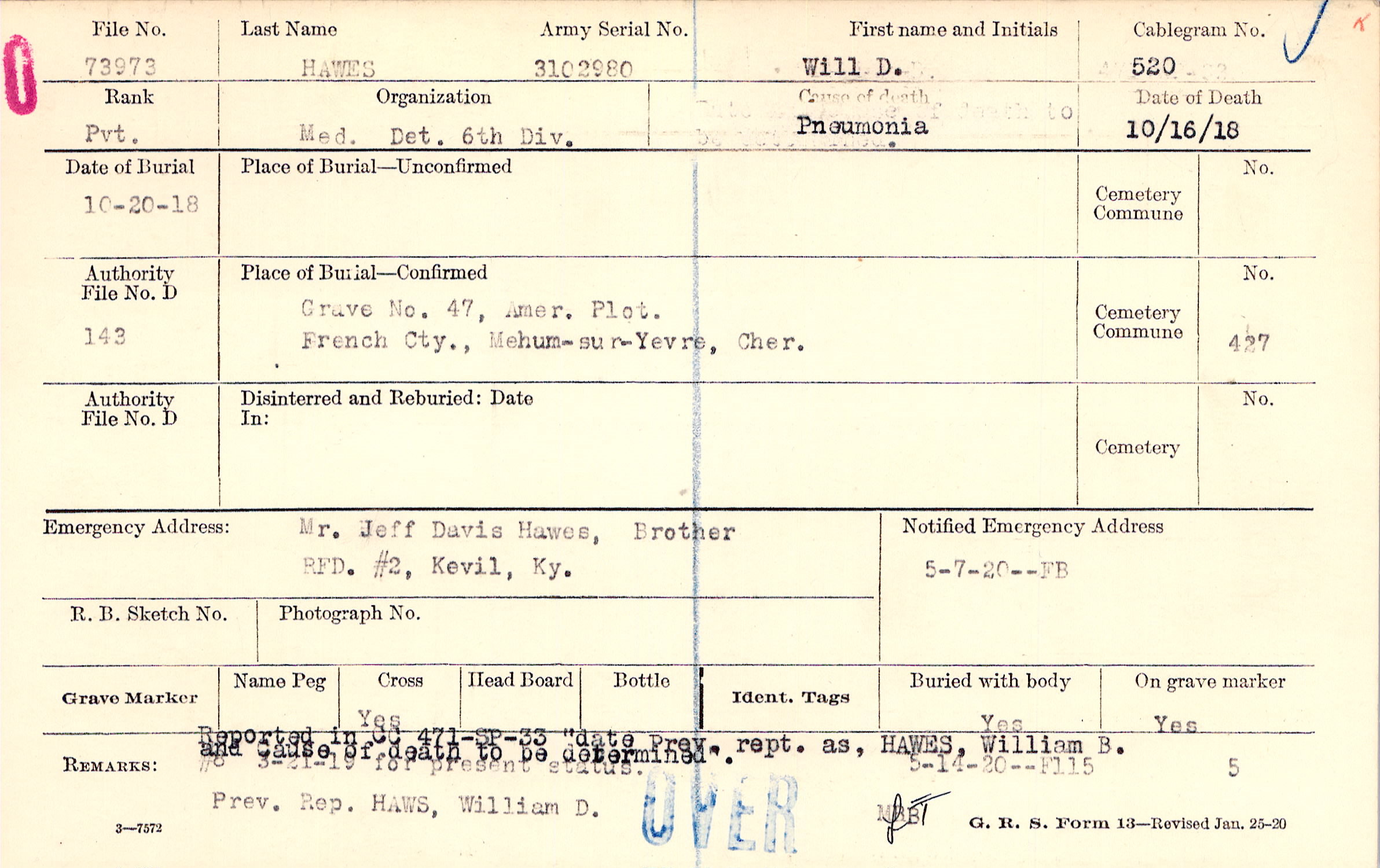 Reported in CC 471-SP-33 "date Pray. rept. as, HAWES WILLIAM B. Prev. Rep. HAWS, William D., #8 3-21-19 for present status., 5-14-20--F115
